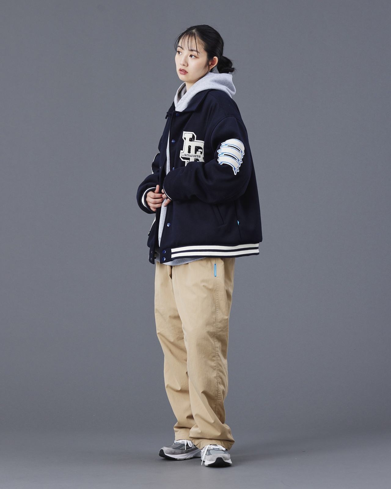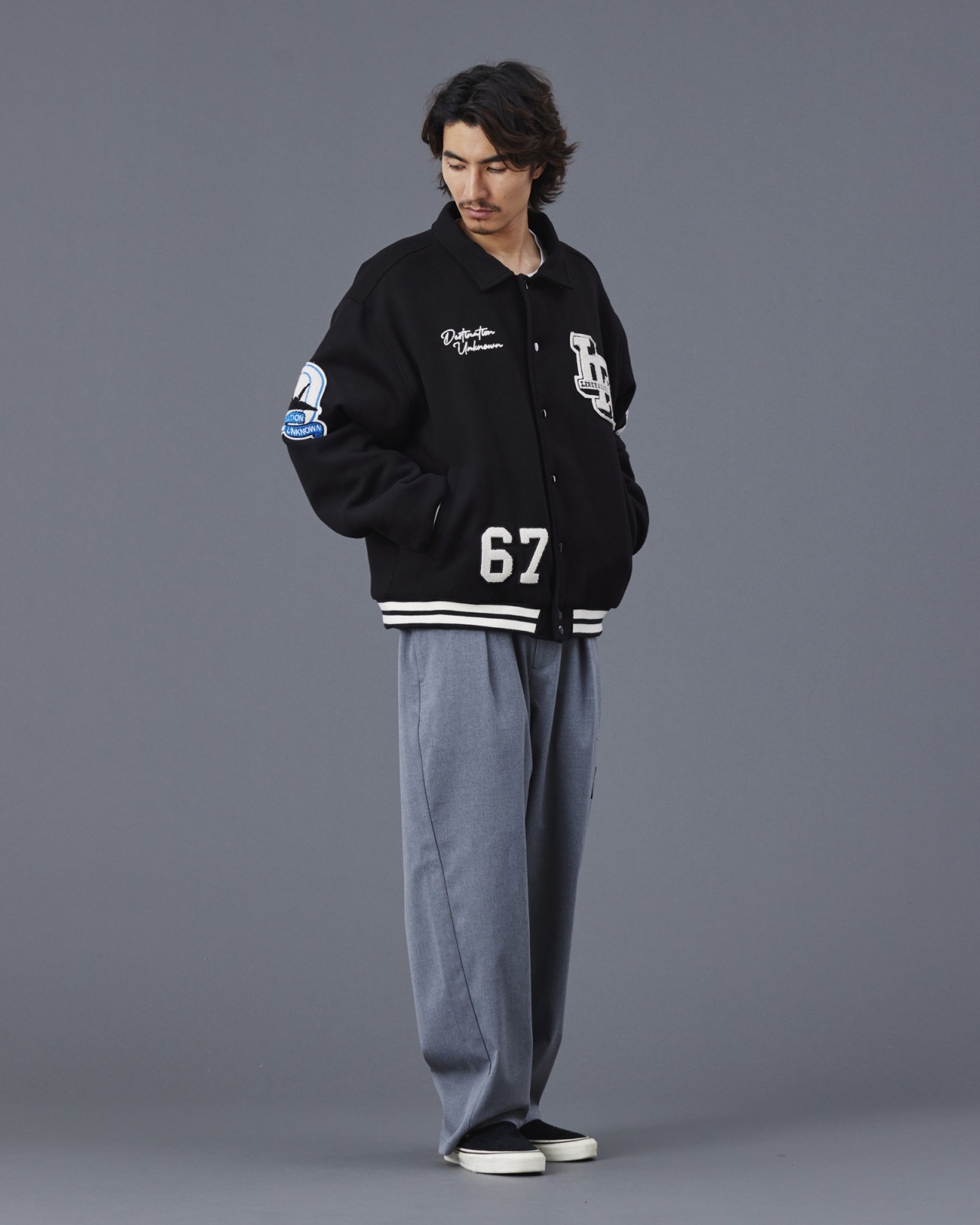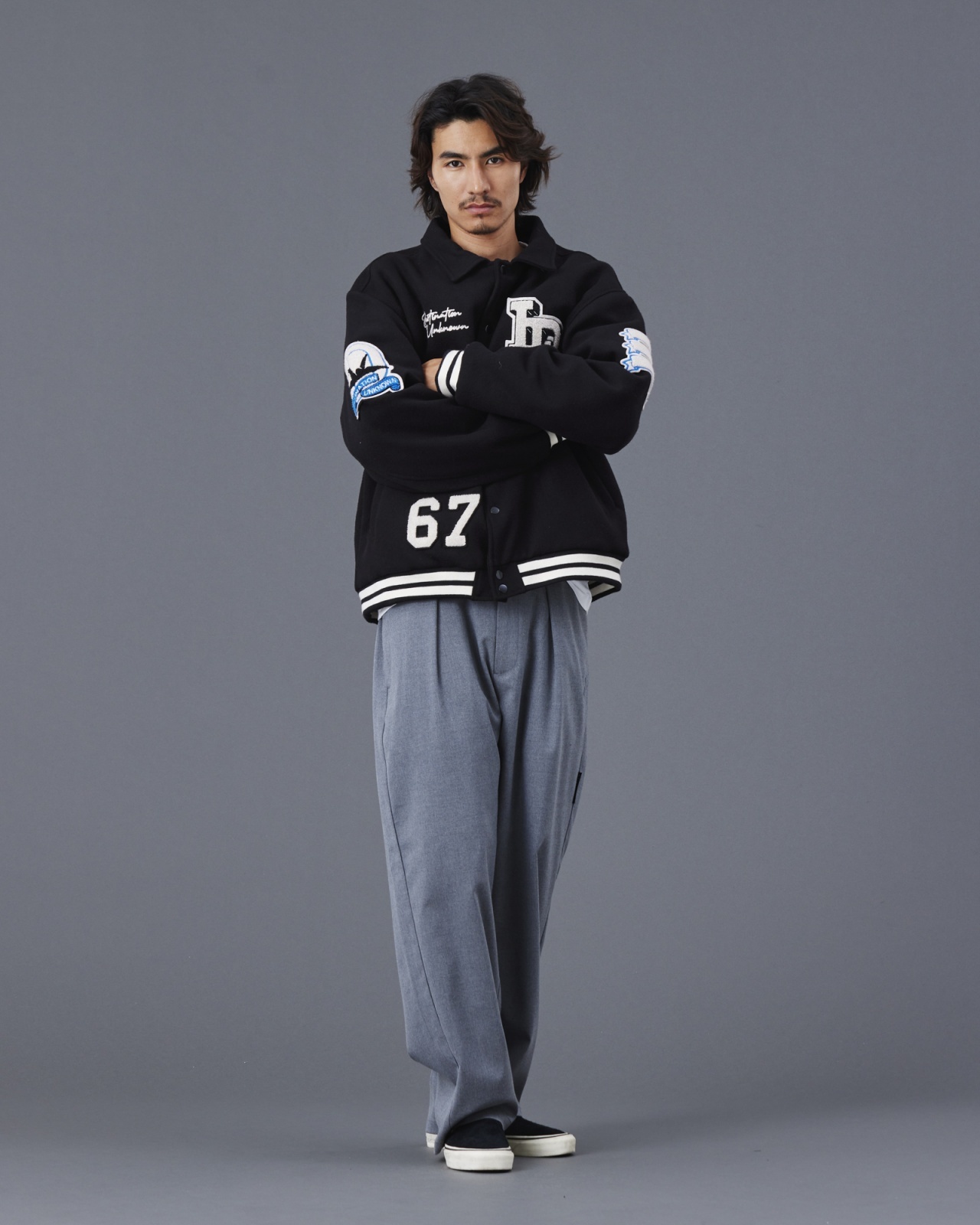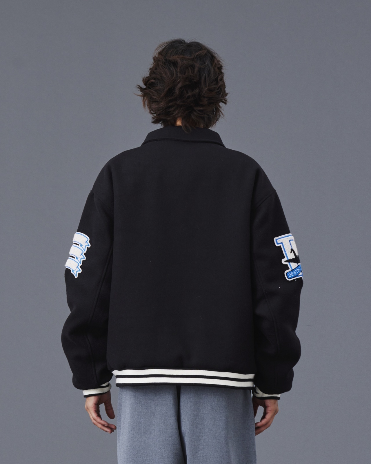 随所に帆施されたワッペンやチェーン刺繍等、本格的な仕様のヴァ―シティジャケットに仕上げています。