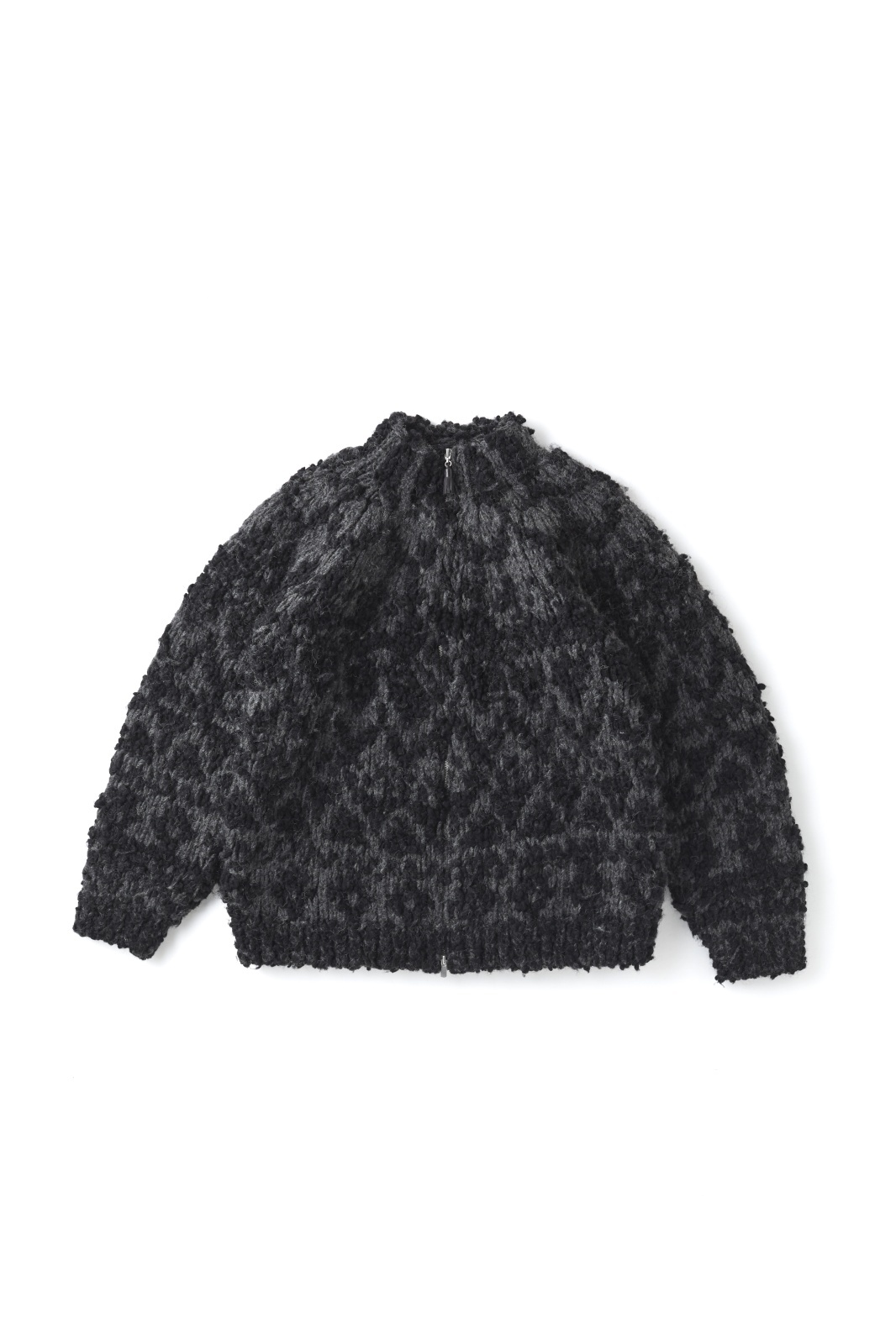 ポコポコとした表情が特徴的な日本製のファンシーヤーンとウールロービングとの組み合わせで柄の強弱を際立たせファンシーヤーンの特徴を活かした編み組織。