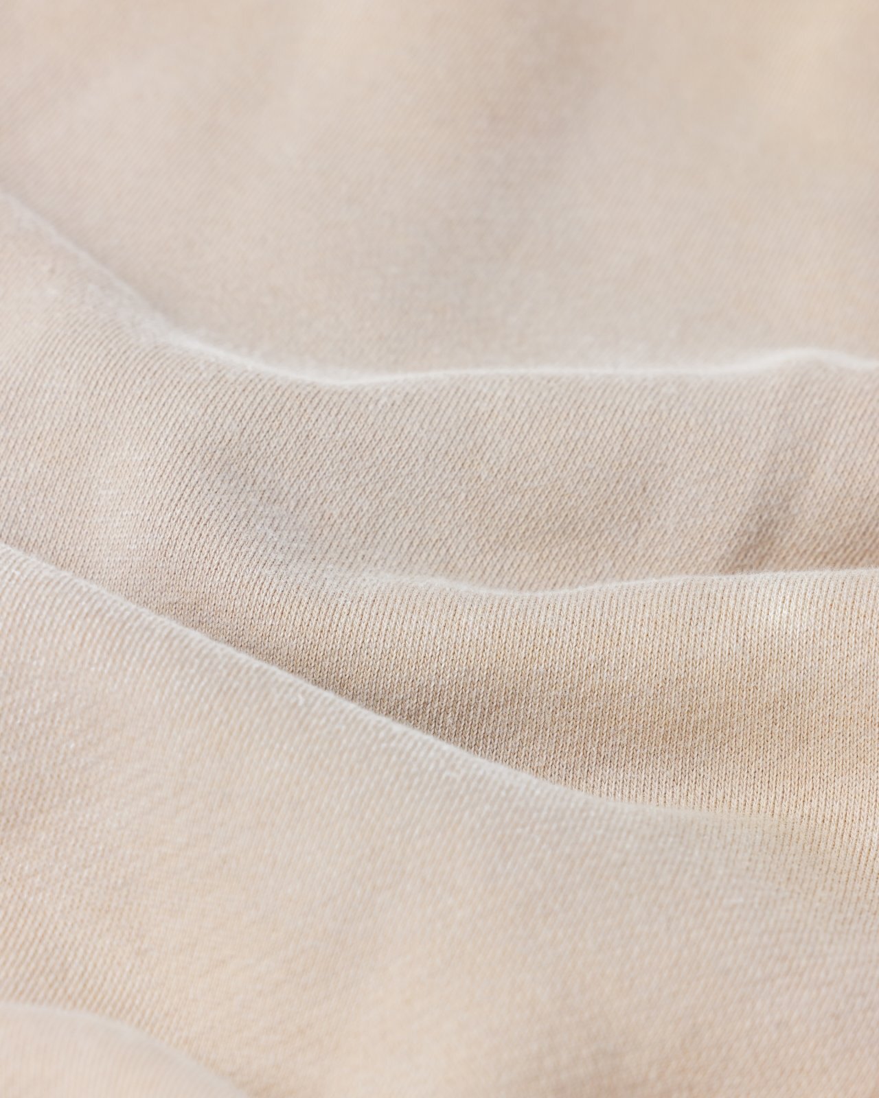 By knitting slowly and carefully, this fabric retains a pleasant stiffness and body, featuring a dry yet delicate touch.