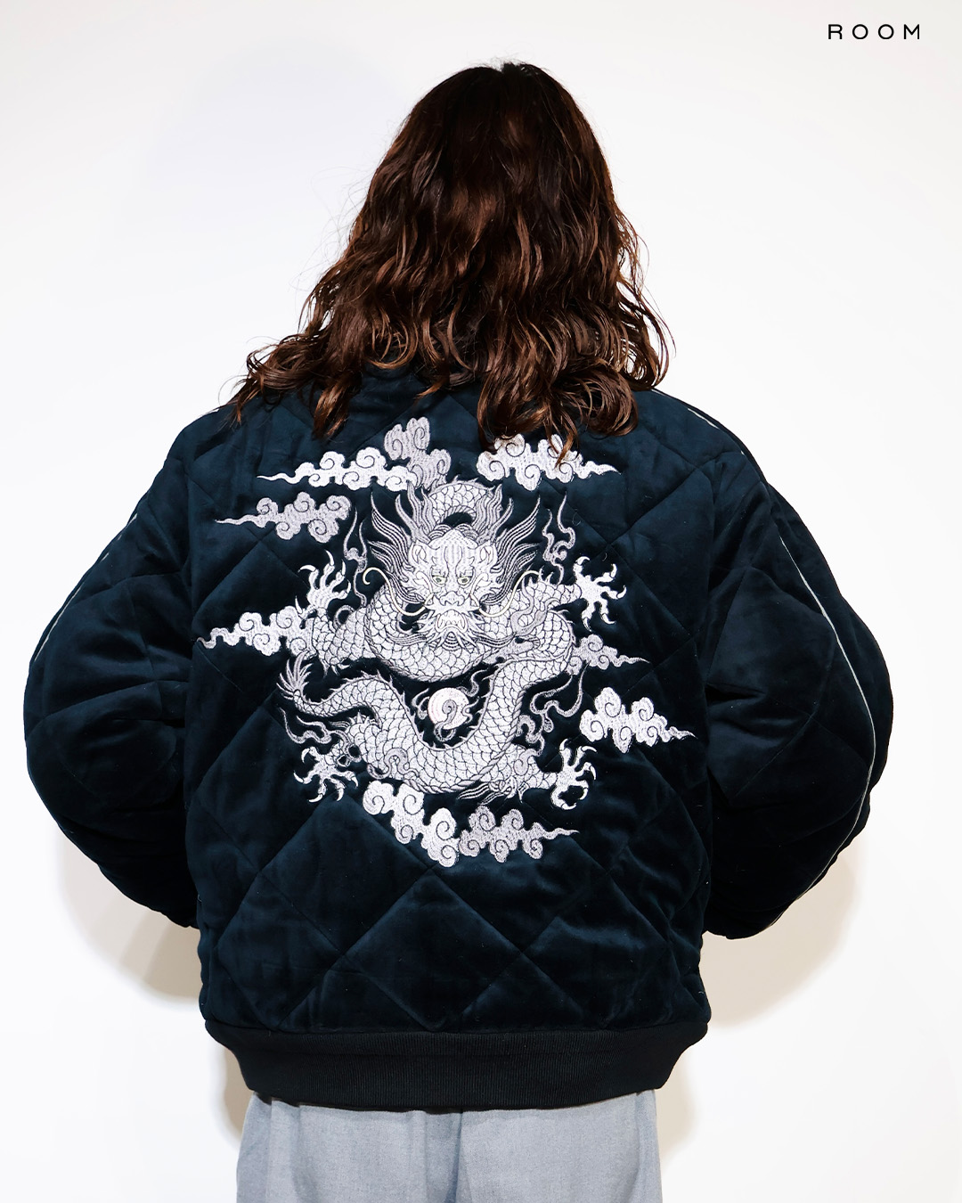 ・ベロア生地にキルティングステッチを施したMA-1スタイルのスーベニアジャケット。
