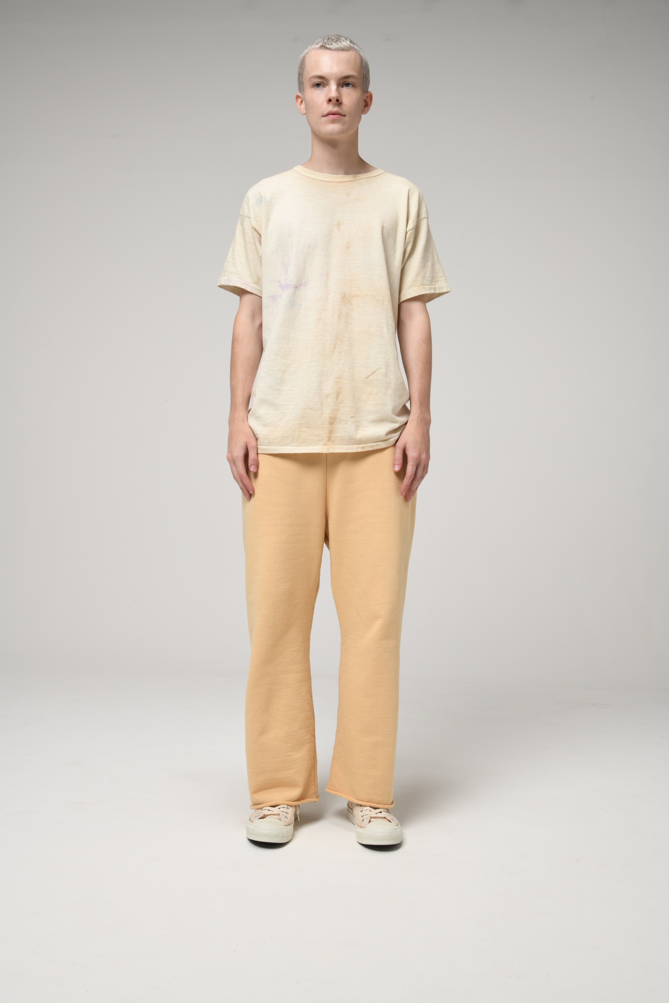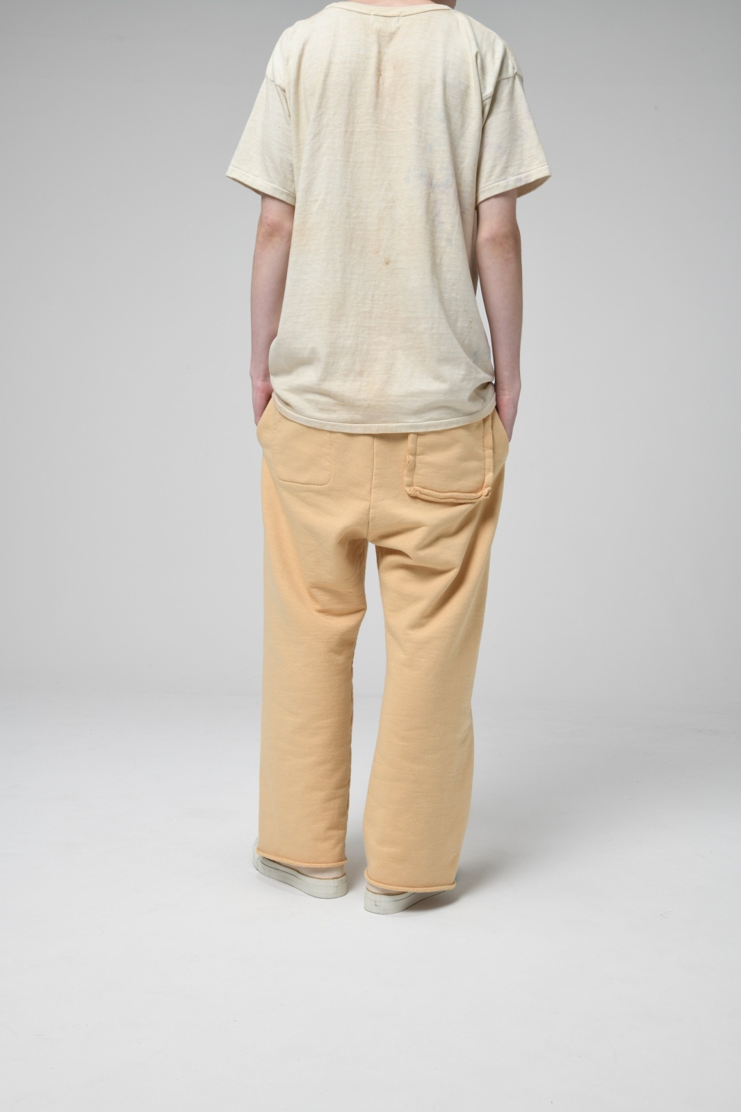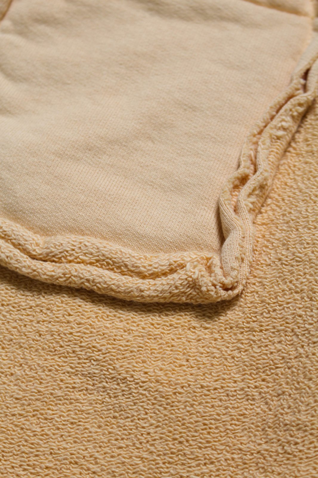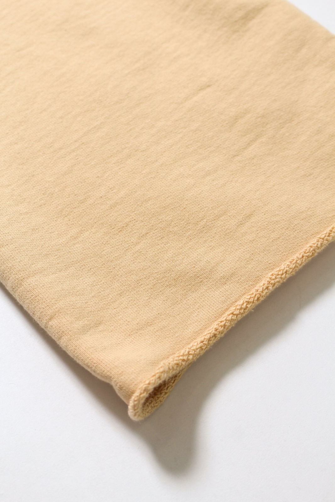 裾は切りっ放し仕様とし、未完成感と荒さをあえて残すことで、古いスウェット特有の空気感と違和感を表現している。