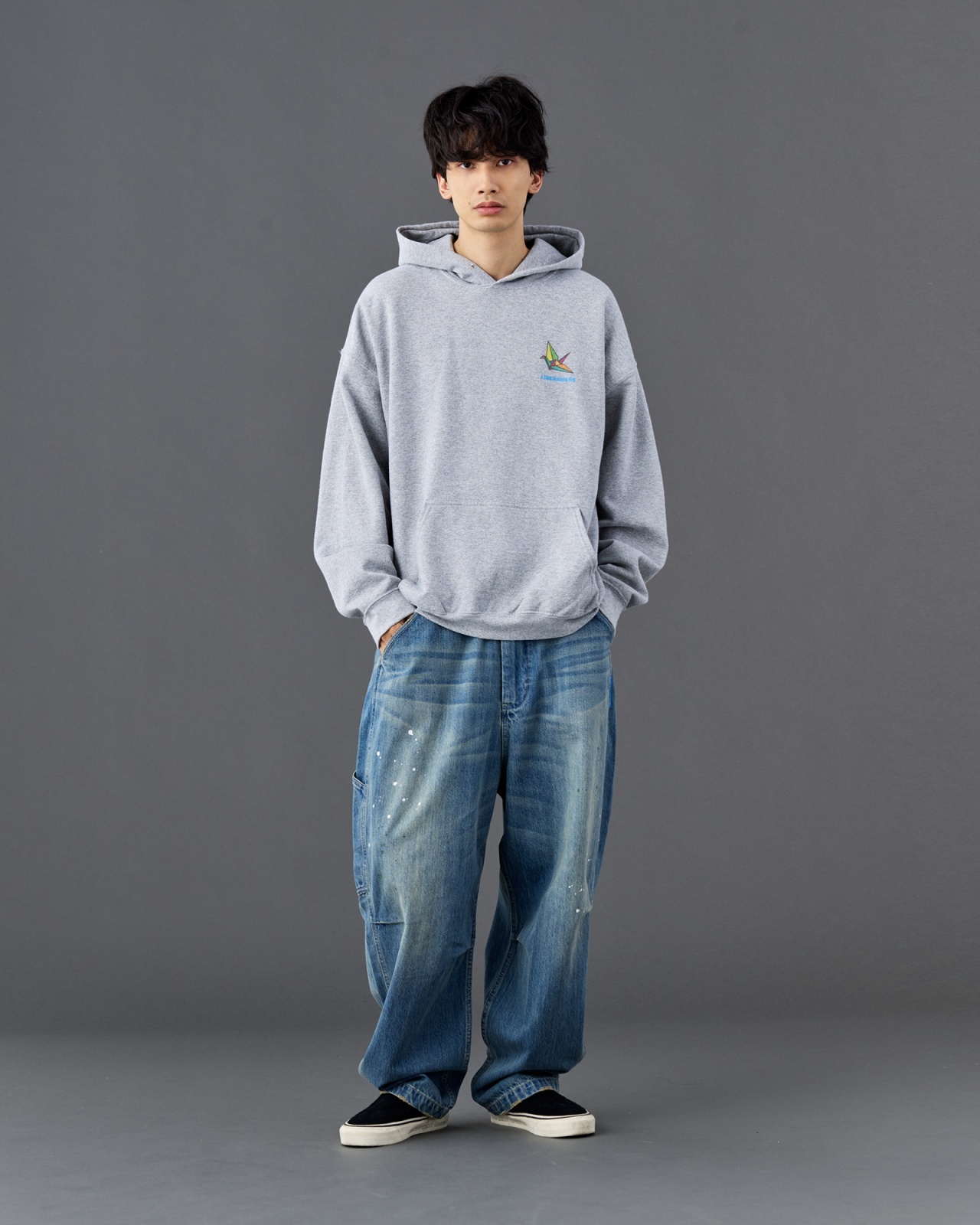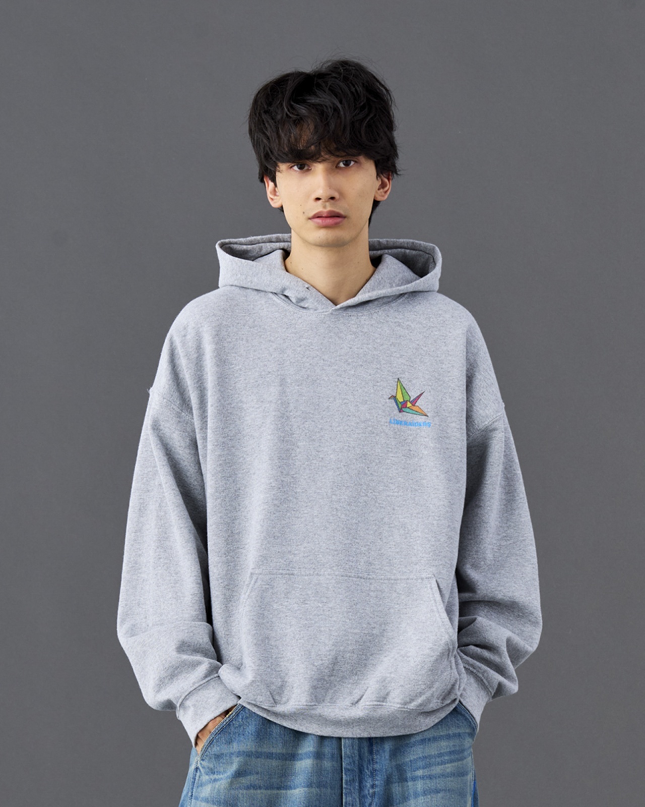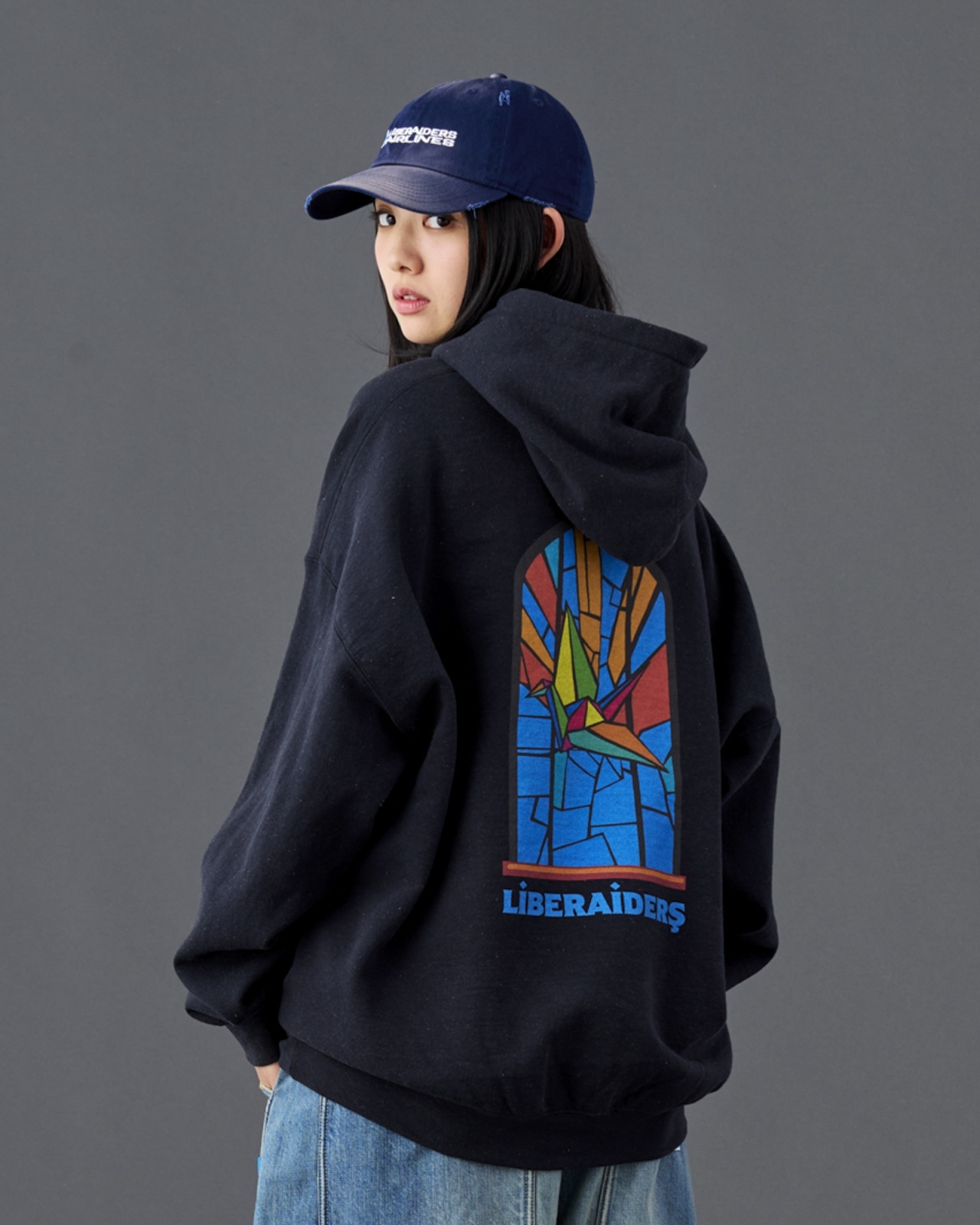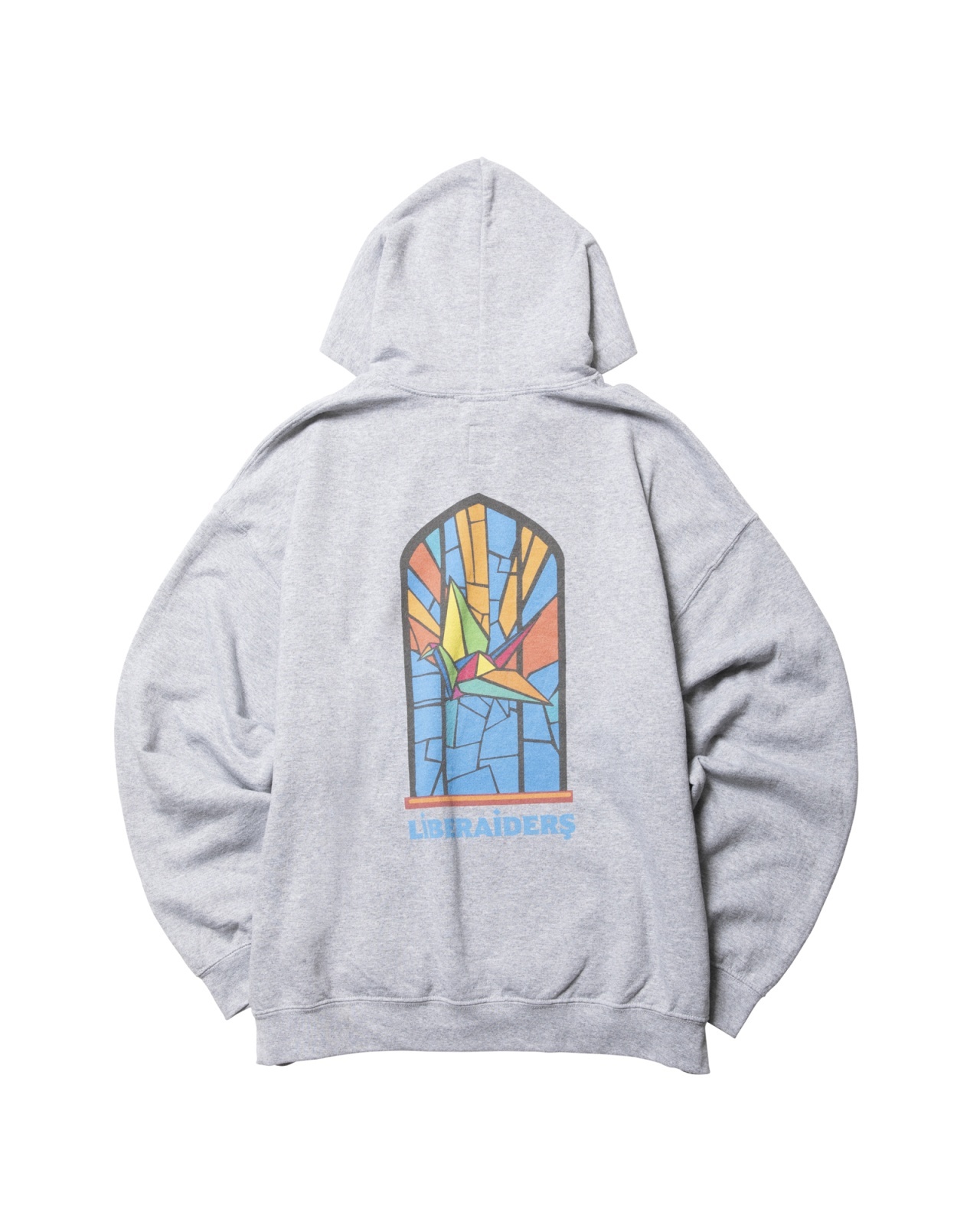 ヴィンテージ感のあるフロスト加工が特徴の8.0oz裏起毛を使用したプルオーバーフーディステンドグラスと折り鶴を融合させたグラフィックが特徴のフーディ。