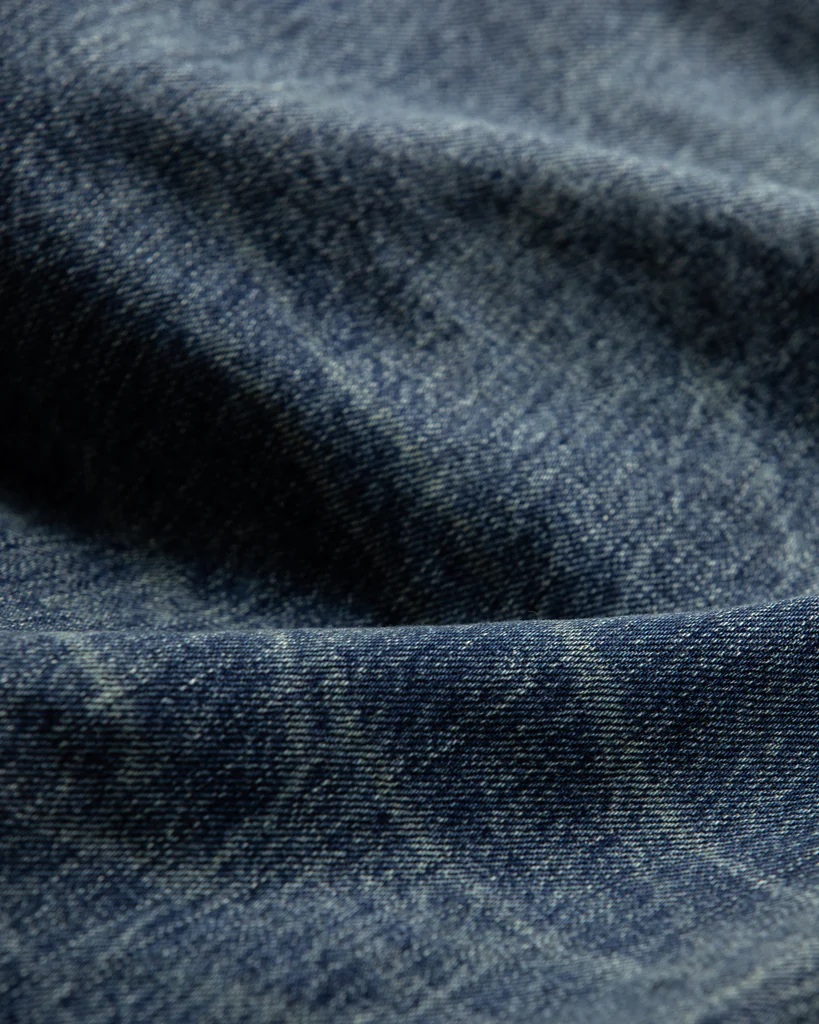 The warp of the fabric is indigo rope-dyed medium-white yarn with a moderately uneven shape.
