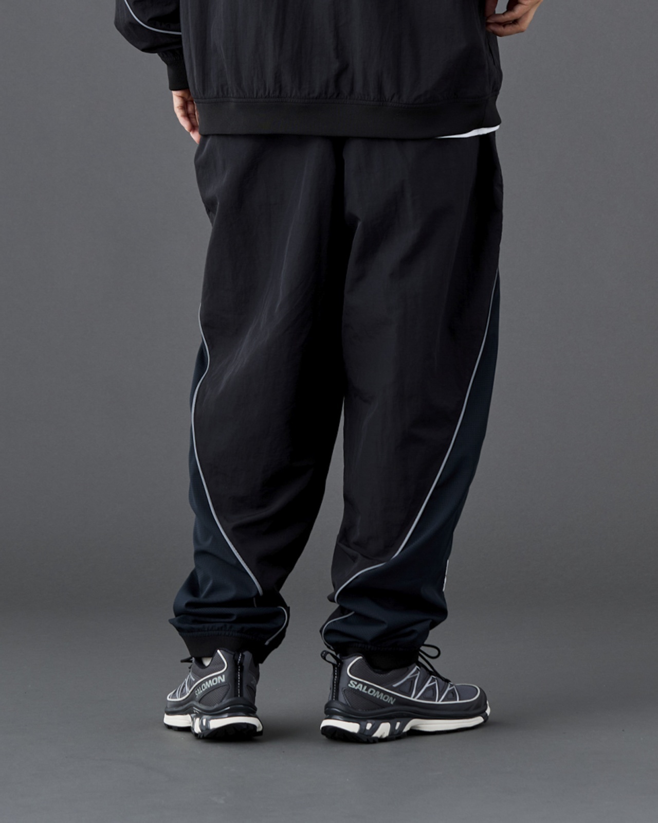 塩縮ナイロン生地を使用したナイロンイージーパンツ。