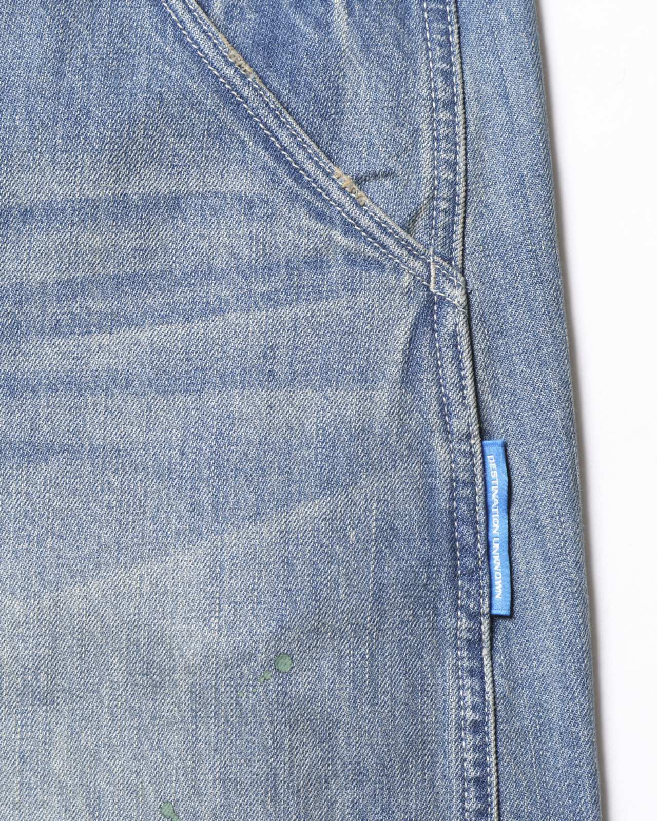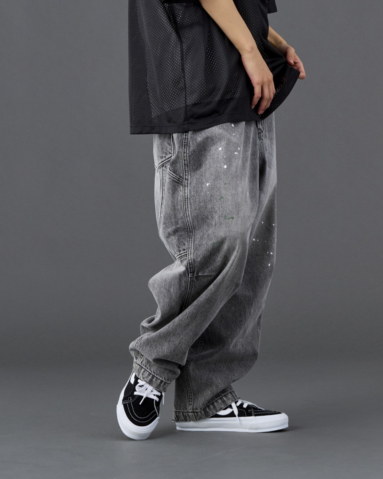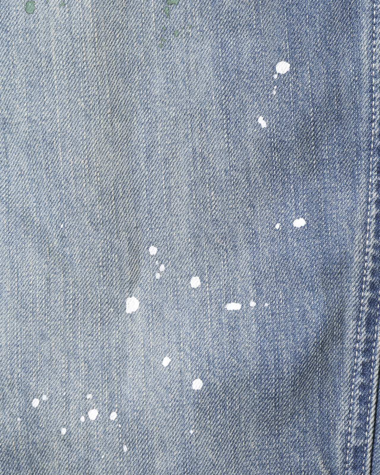 ポケット周り、ベルトループにはロープを入れて補強、全体にペンキ飛ばし加工を施したリアルな加工感のルックスに仕上げました。