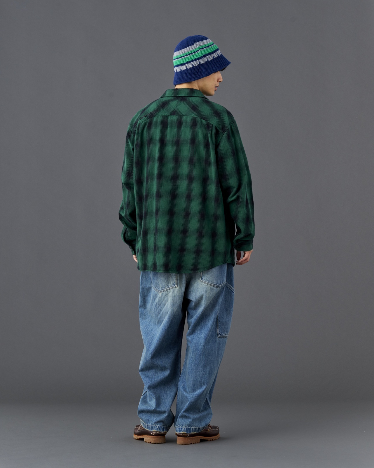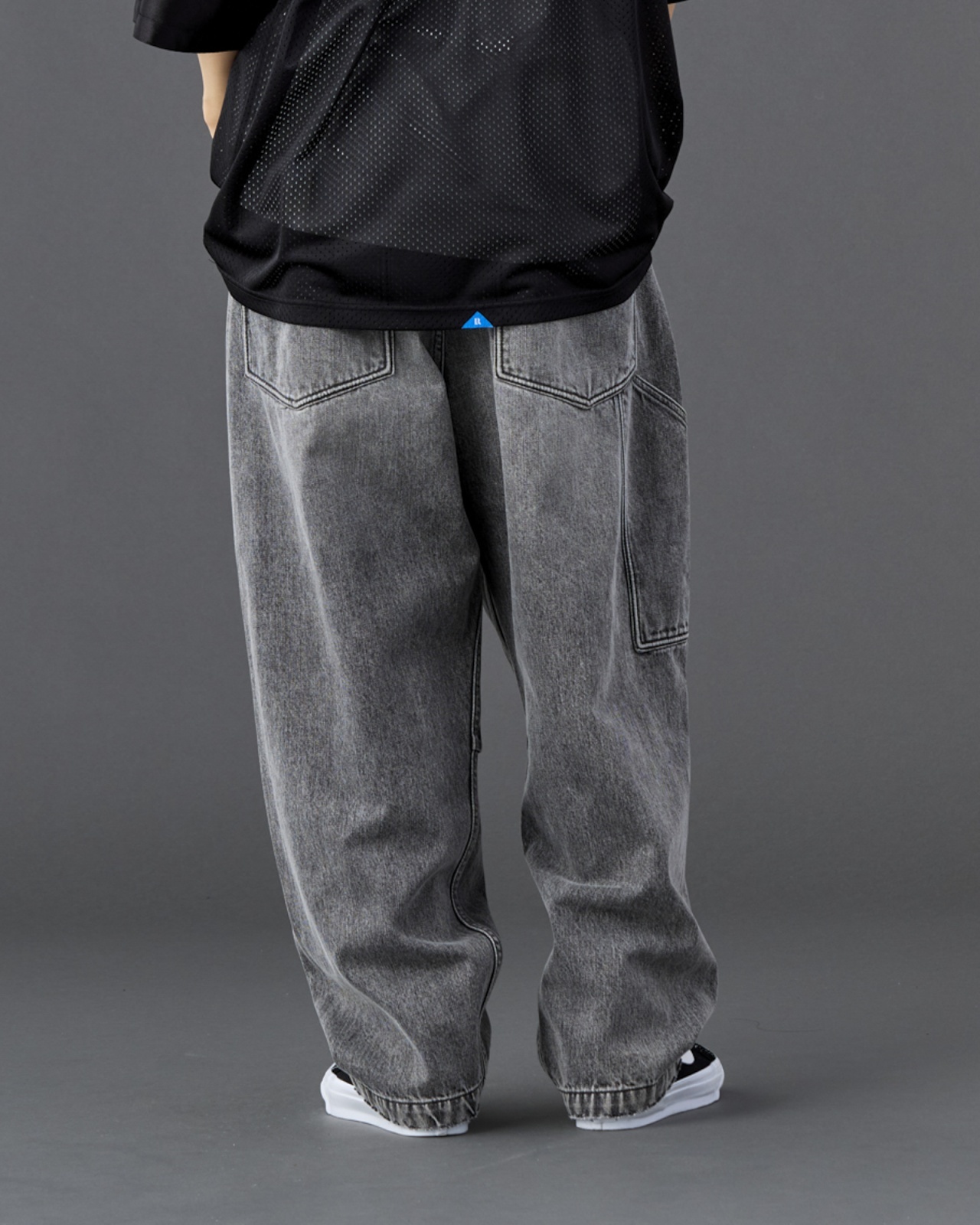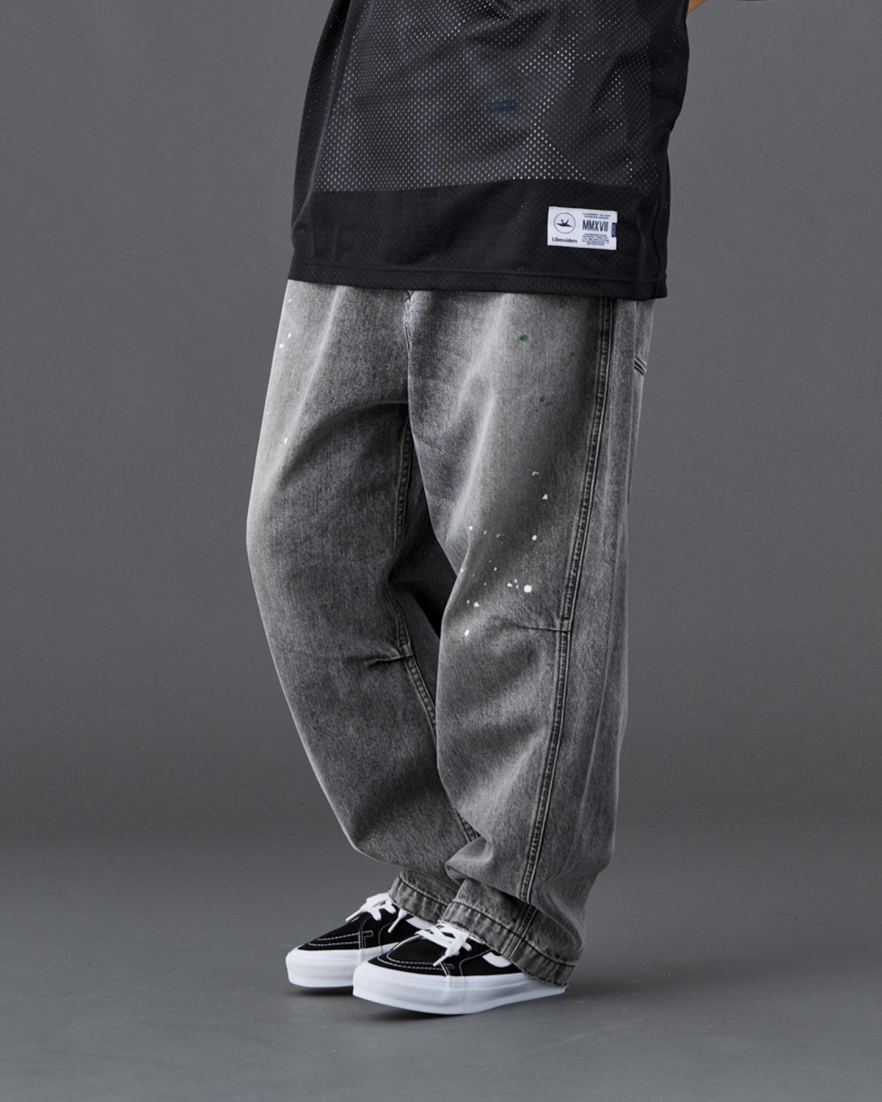 ポケット周り、ベルトループにはロープを入れて補強、全体にペンキ飛ばし加工を施したリアルな加工感のルックスに仕上げました。