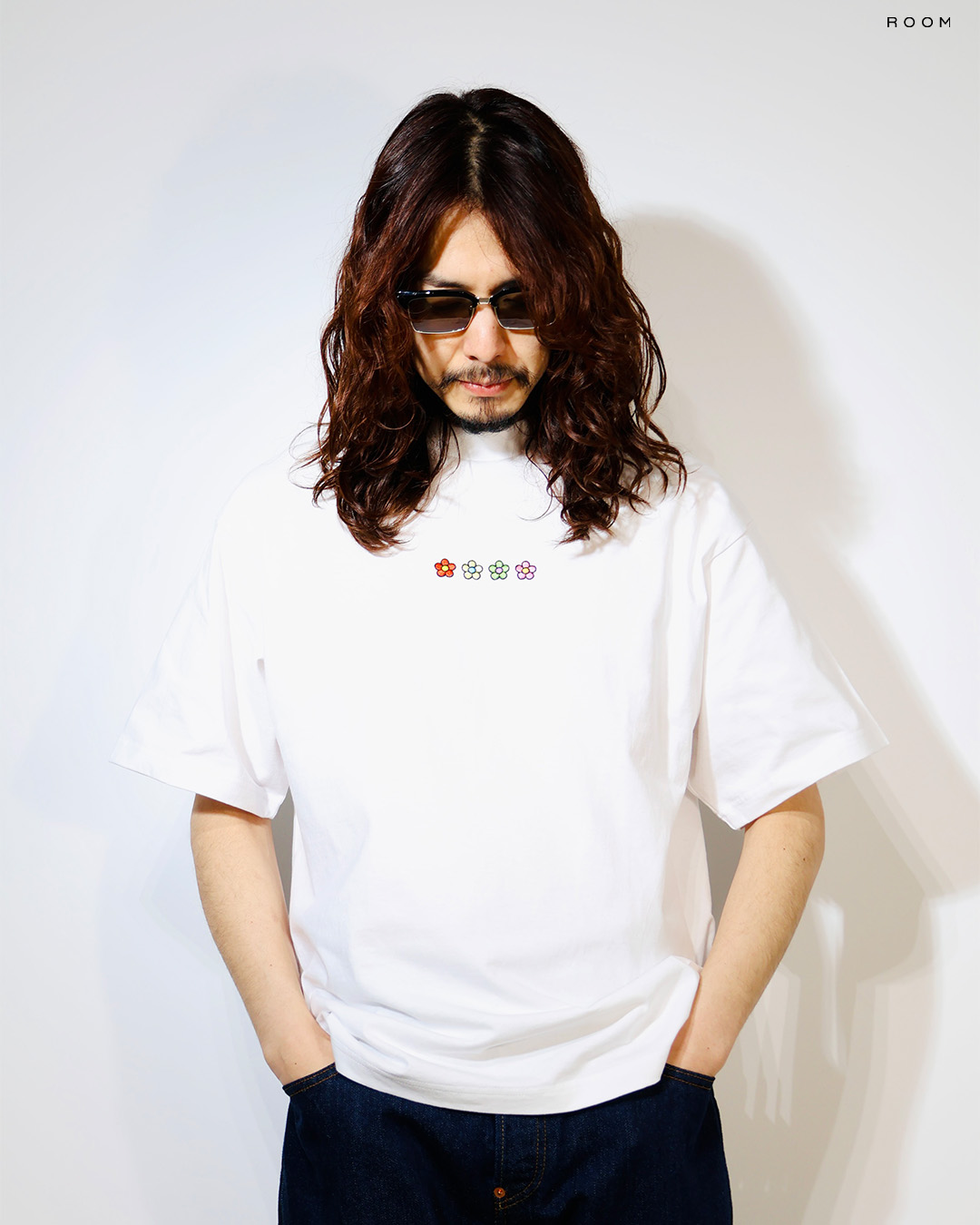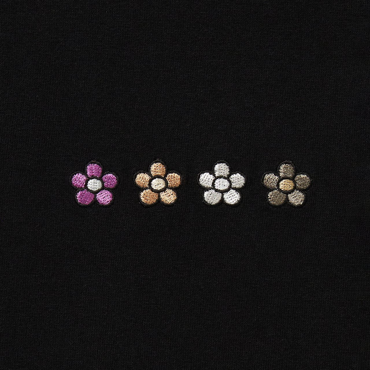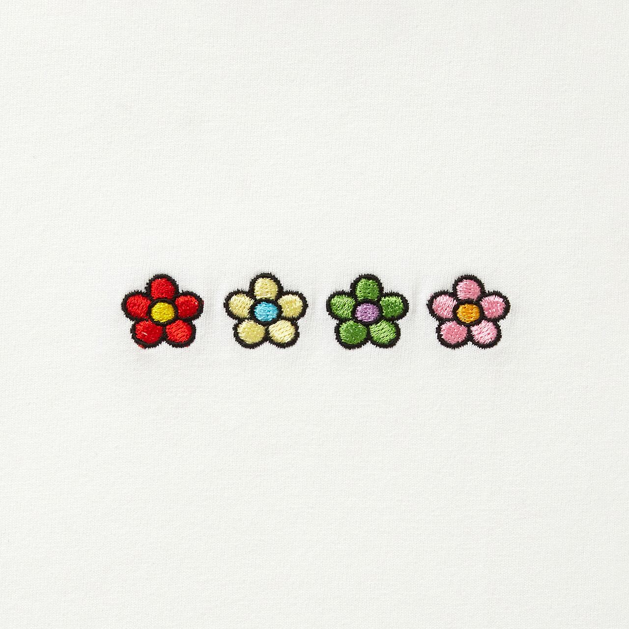 胸の中央に4色のアイコニックなフラワー刺繍が配置されたTシャツ。