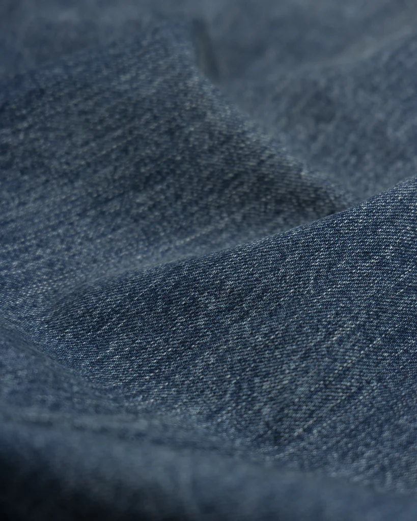 The warp of the fabric is indigo rope-dyed medium-white yarn with a moderately uneven shape.