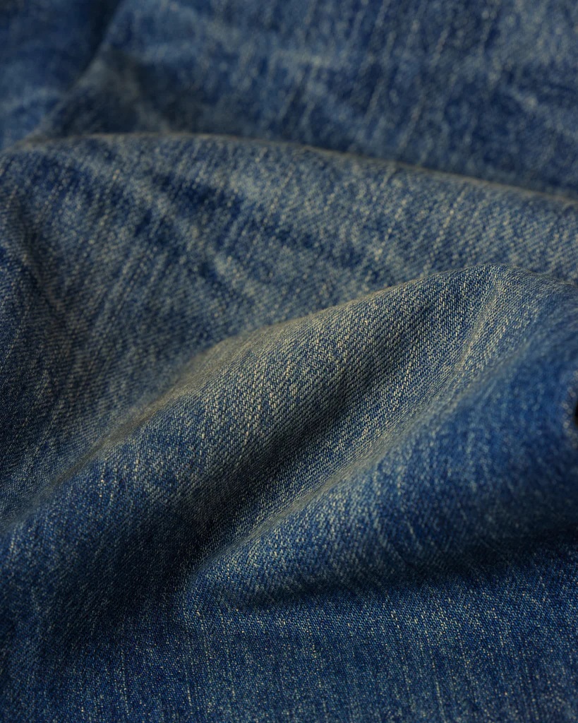 The warp of the fabric is indigo rope-dyed medium-white yarn with a moderately uneven shape.