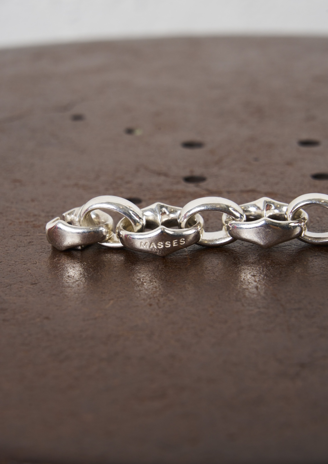 オリジナルで作成したコマを2連のリングで接続した、非常に手の込んだ仕様のシルバーブレスレット。