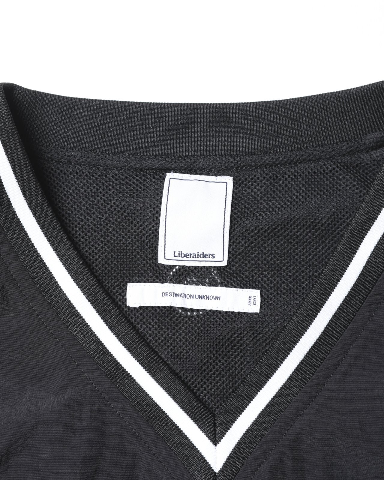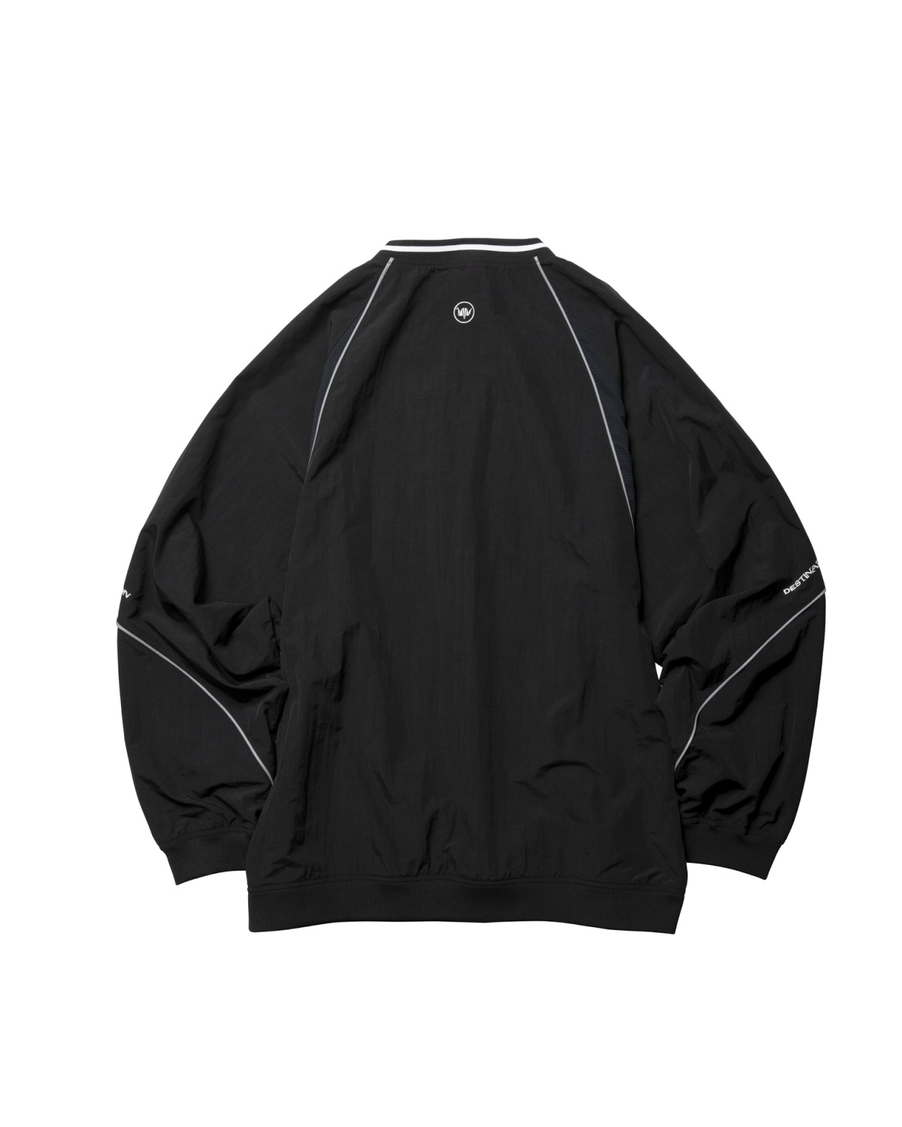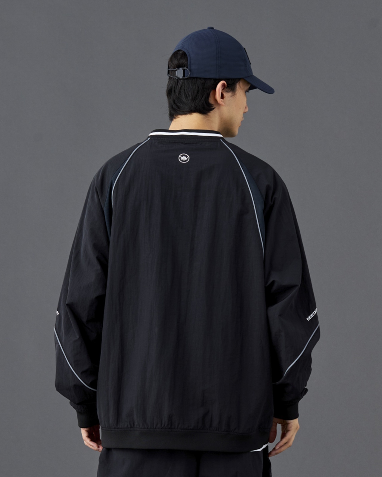 塩縮ナイロン生地を使用したVネックプルオーバー。