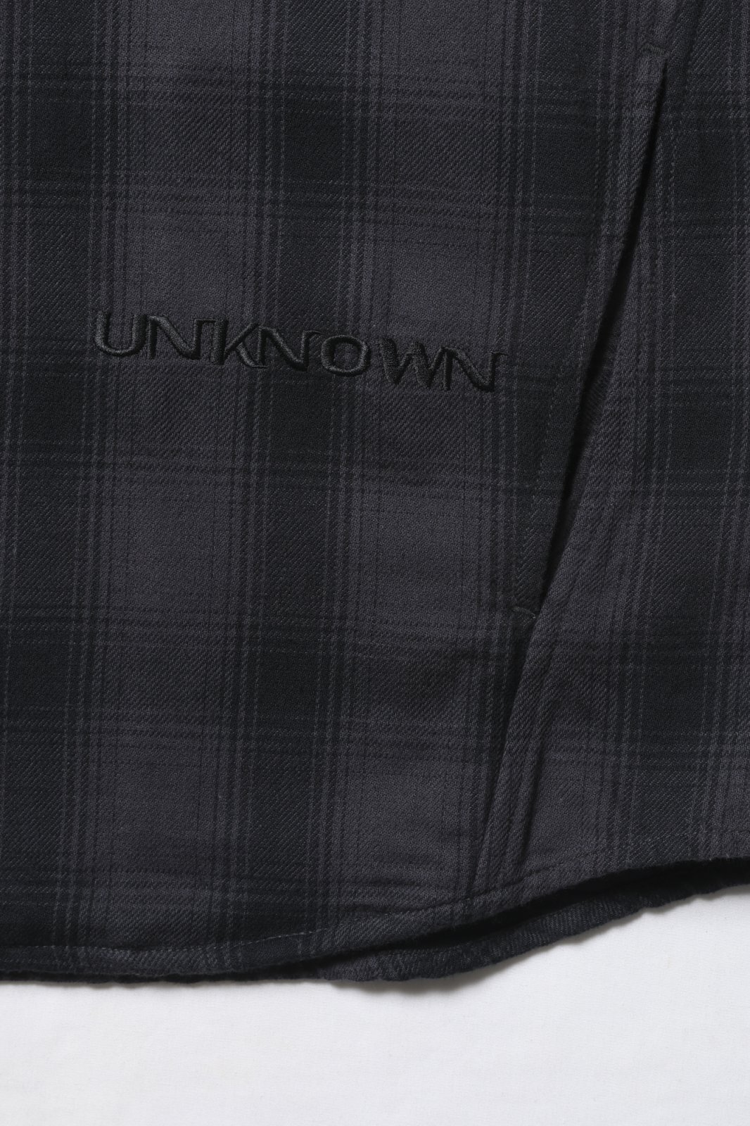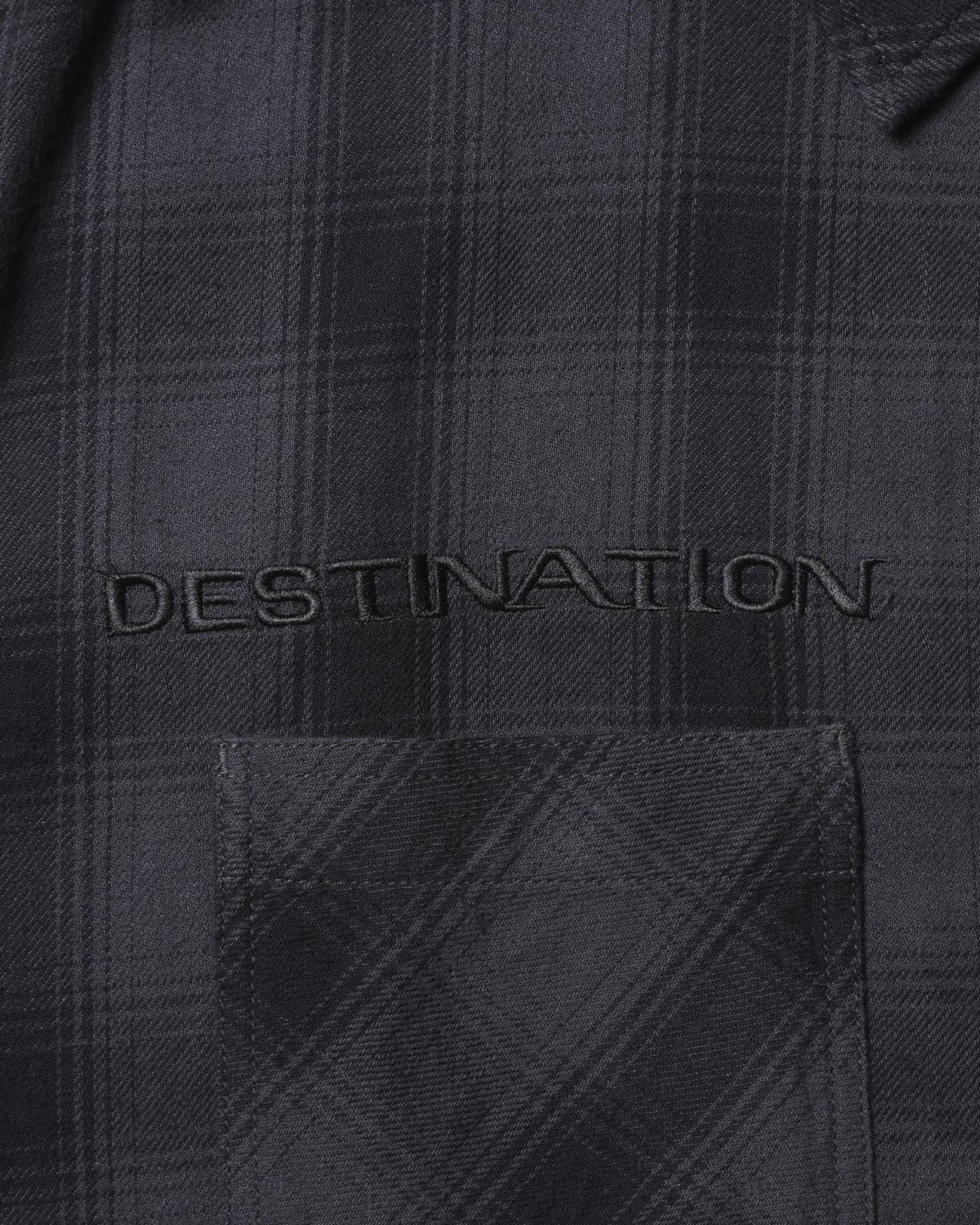 右胸、左裾には DESTINATION UNKNOWN のロゴが同色で刺繍されています。