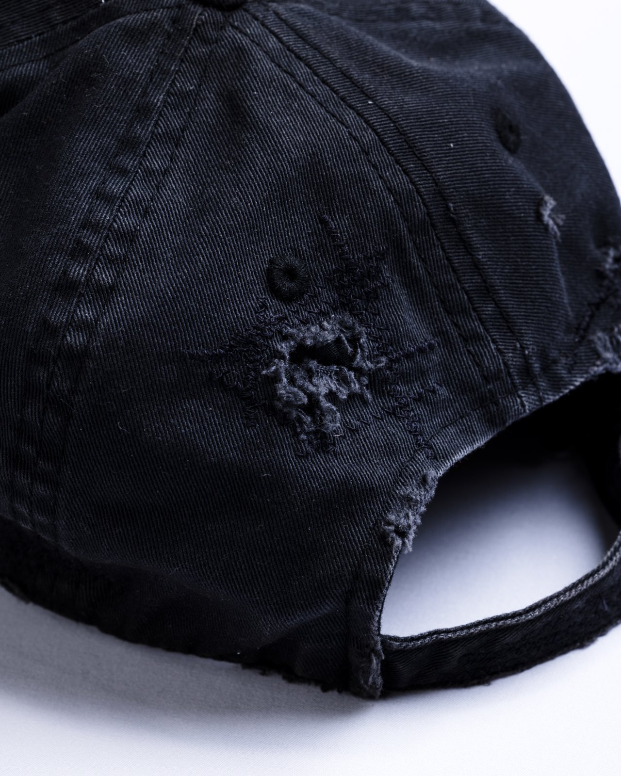 ダメージ加工を施し、ステッチで補強を加えたキャップ。