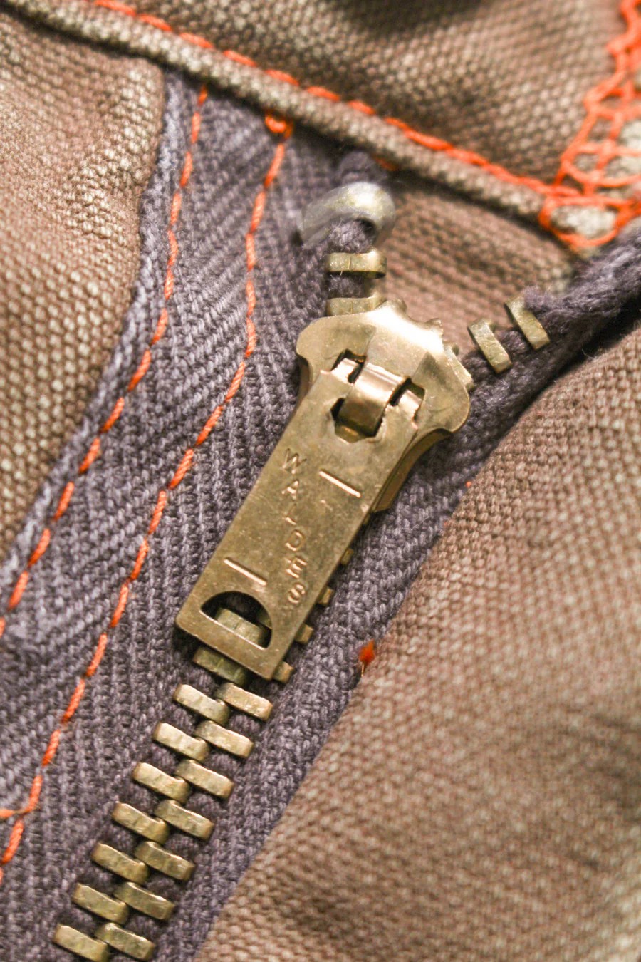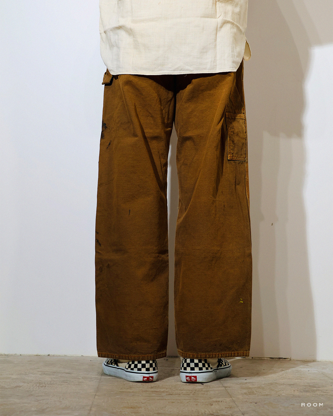 ブラウンダックのワークパンツを、40年代初頭に見られるフロントポケットまで一体で補強されたダブルニー仕様を背景に製作。