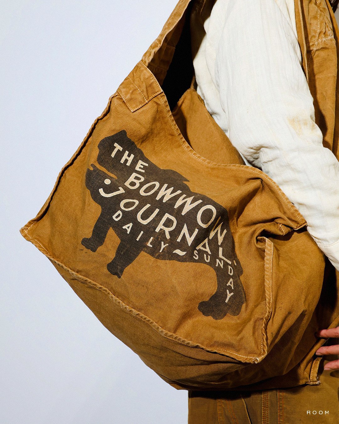 Inspired by pre-1930s newspaper delivery bags, featuring THE BOW WOW JOURNAL bulldog icon.