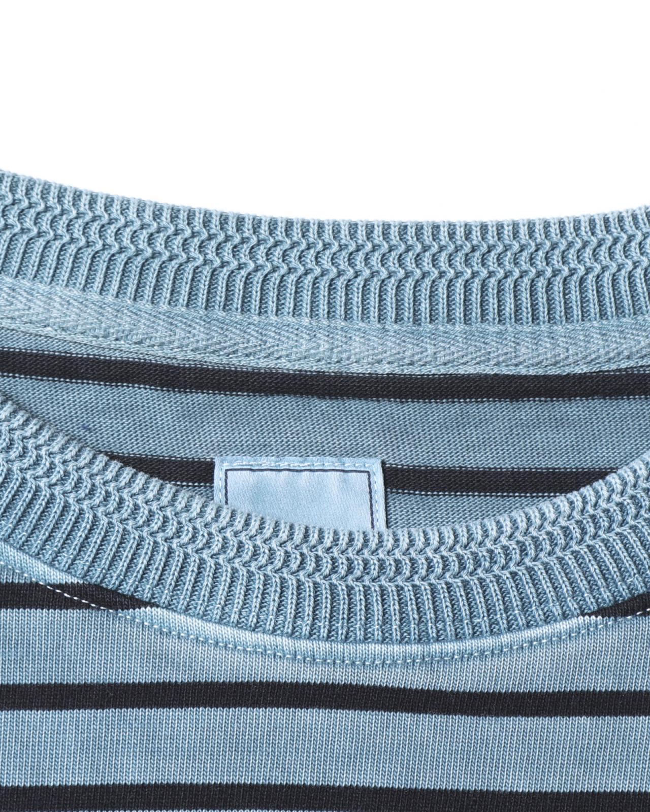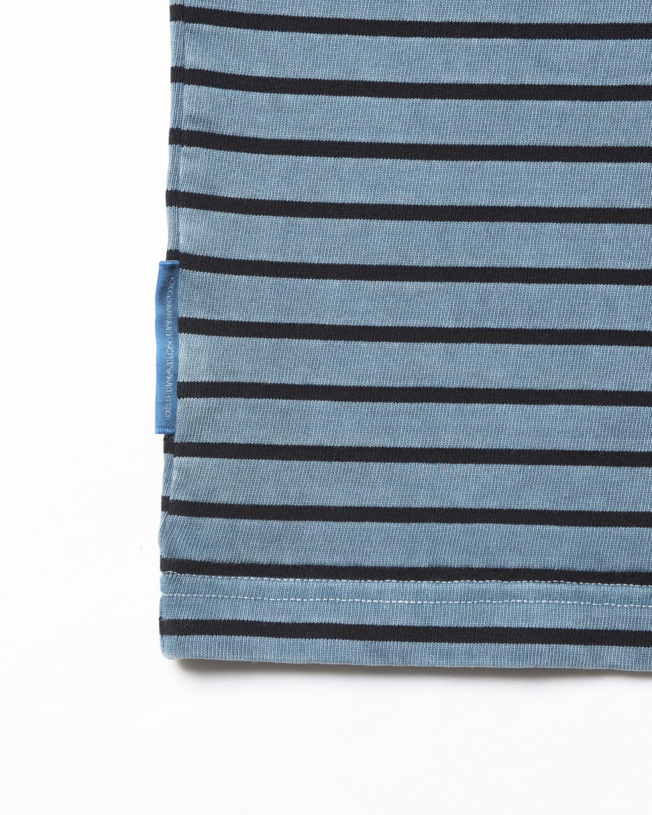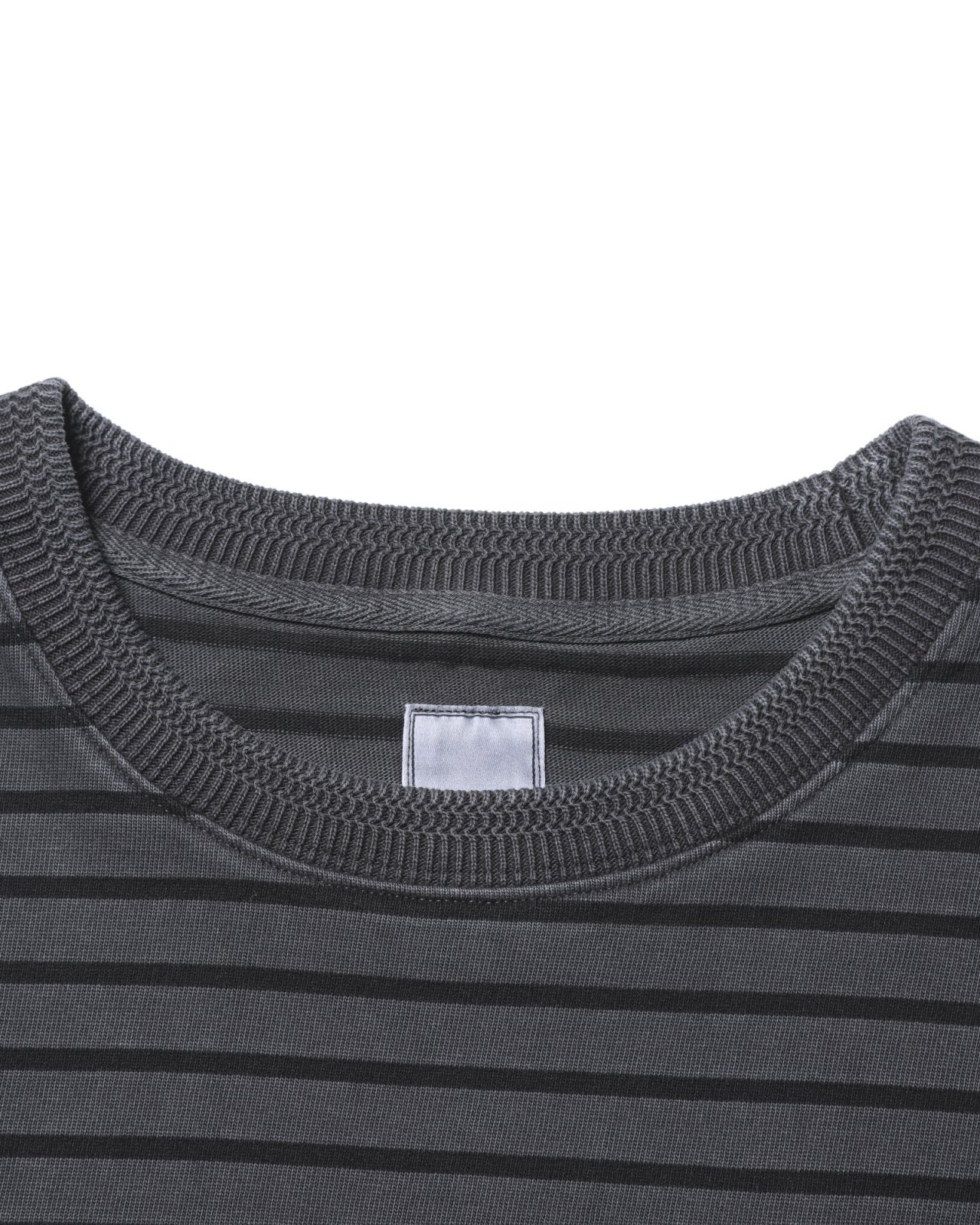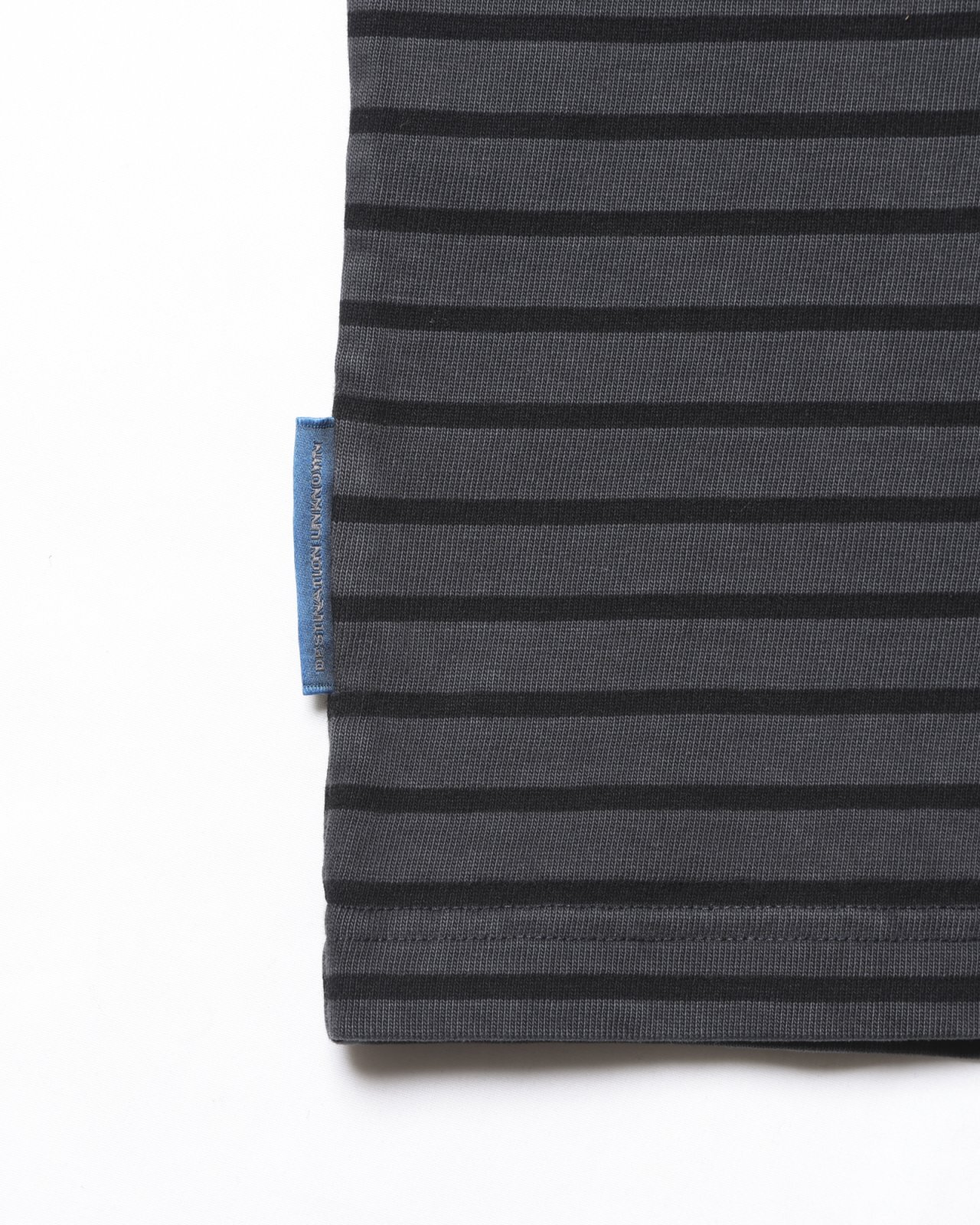 地厚な細ピッチボーダー生地の長袖 T シャツ。ピグメント染めをしているので独特の加工感があります。