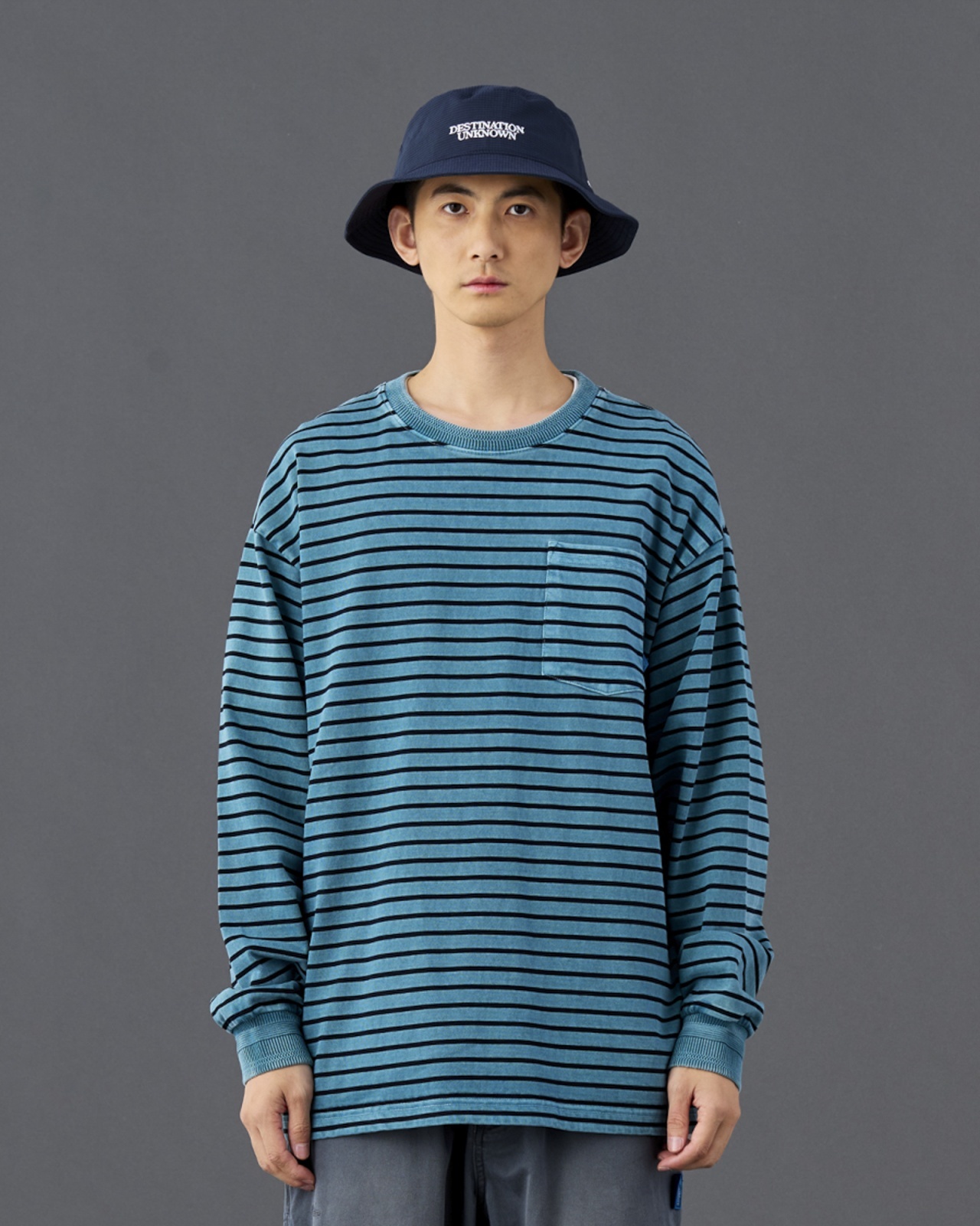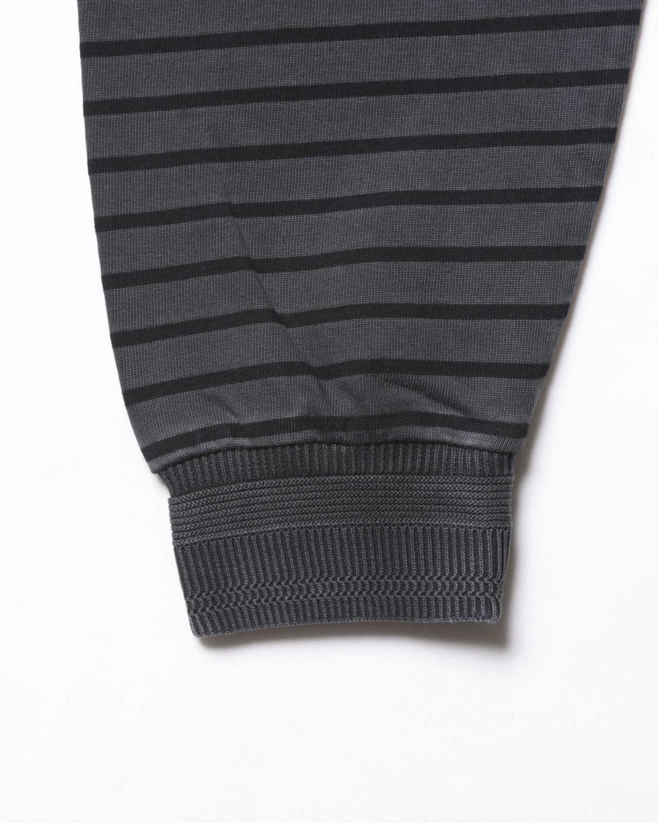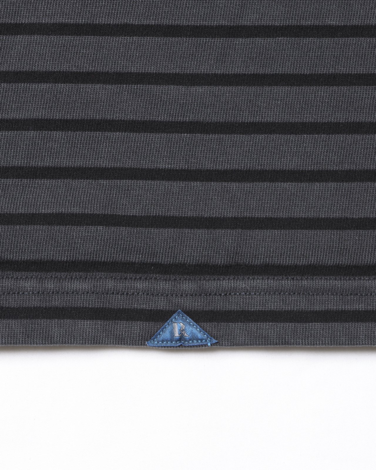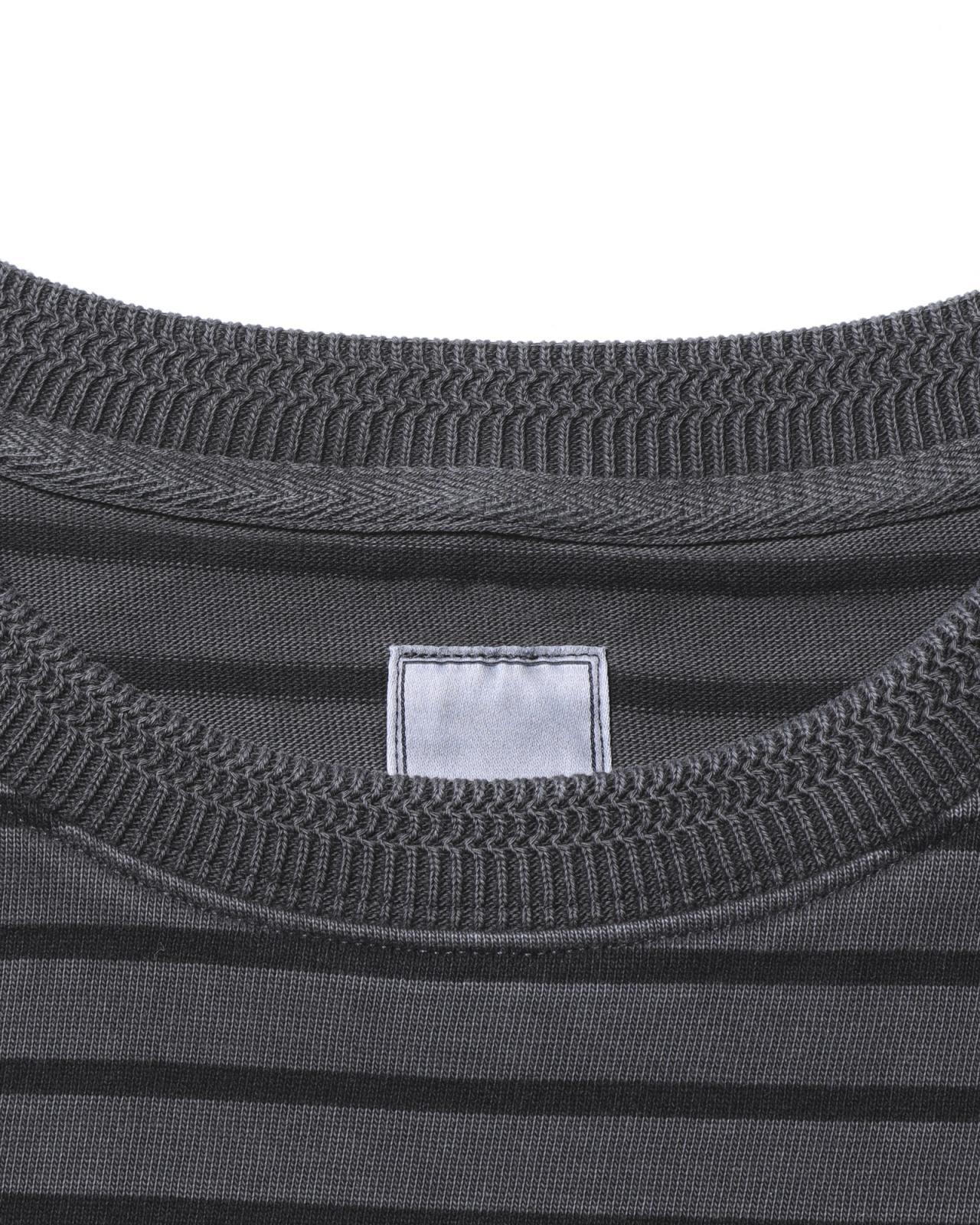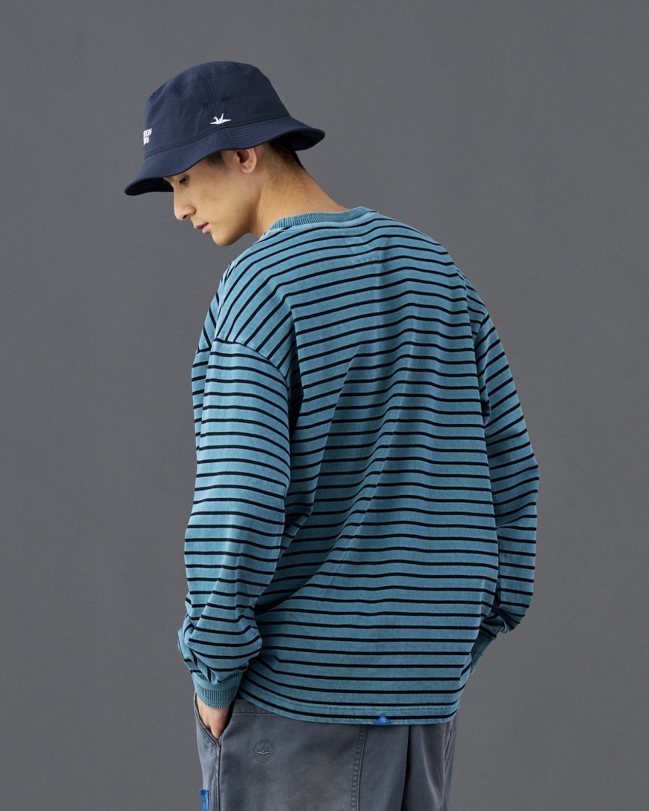 地厚な細ピッチボーダー生地の長袖 T シャツ。ピグメント染めをしているので独特の加工感があります。