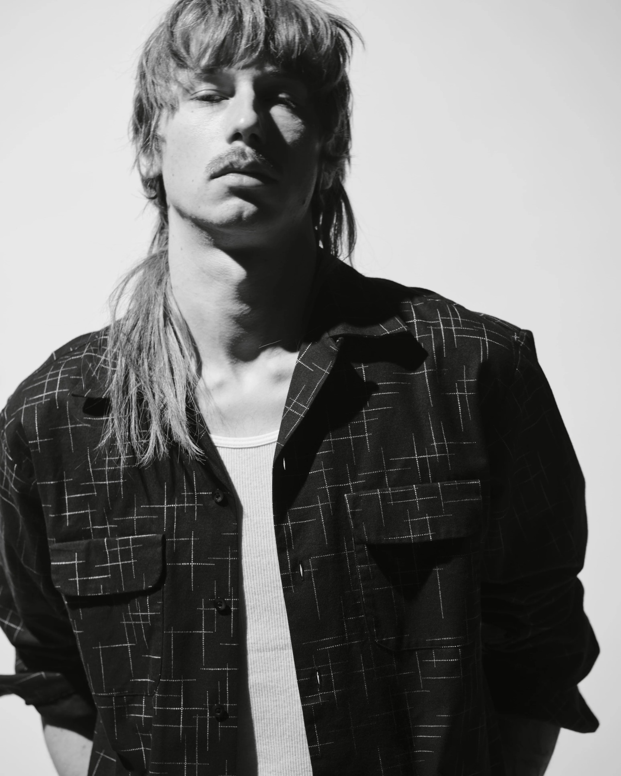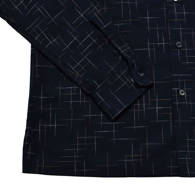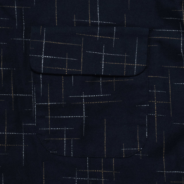 繊細な柄が生地に奥行きを与え、無地にはない存在感と上品さを演出。胸元にはフラップ付きのパッチポケットを配し、ワークシャツのディテールをモダンに再構築。