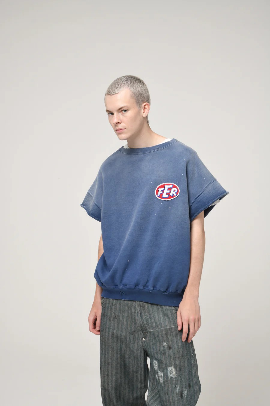 A short-sleeve sweatshirt with a logo patch, adding an industrial, powerful mood drawn from the motor-industry world.