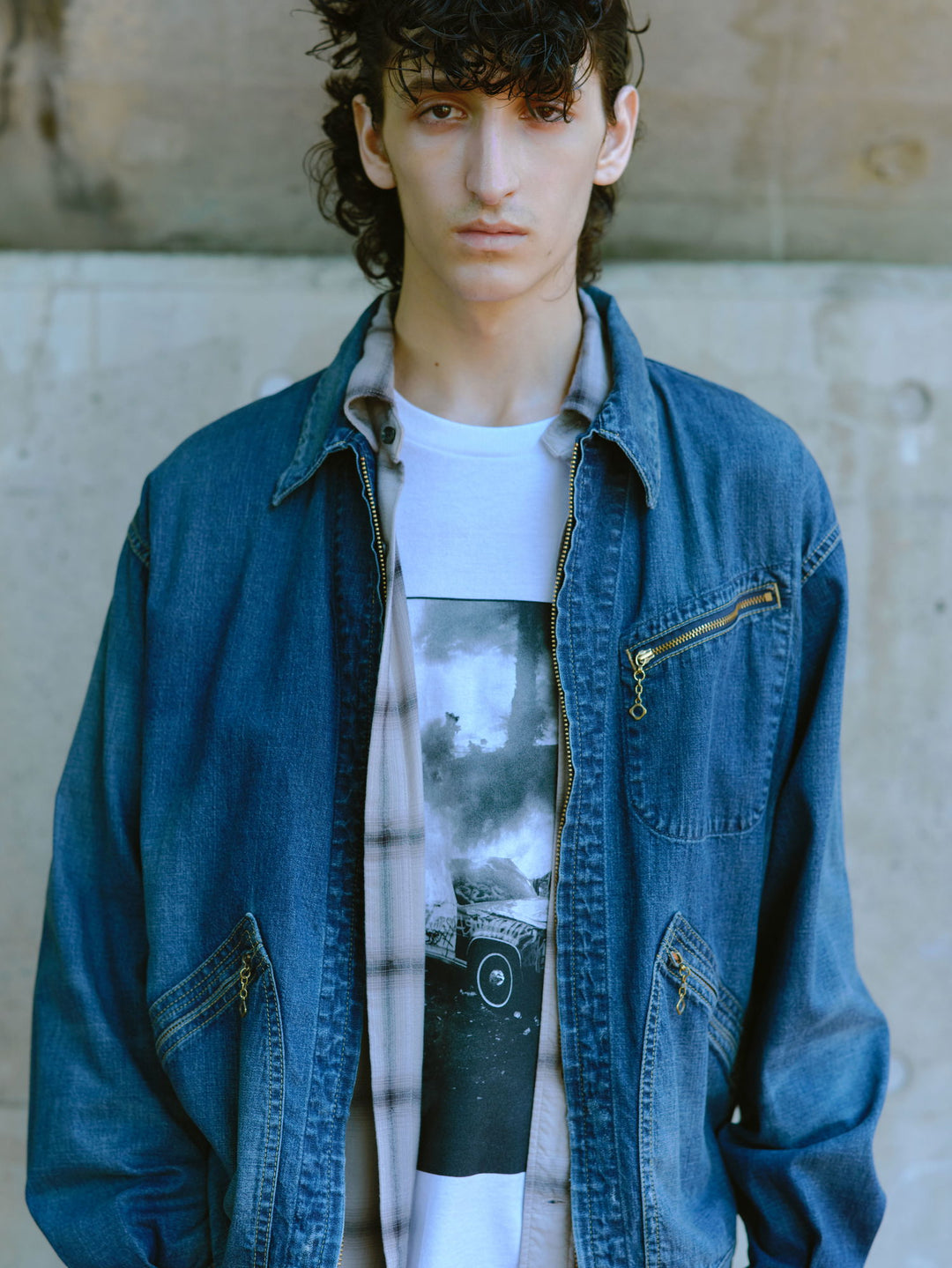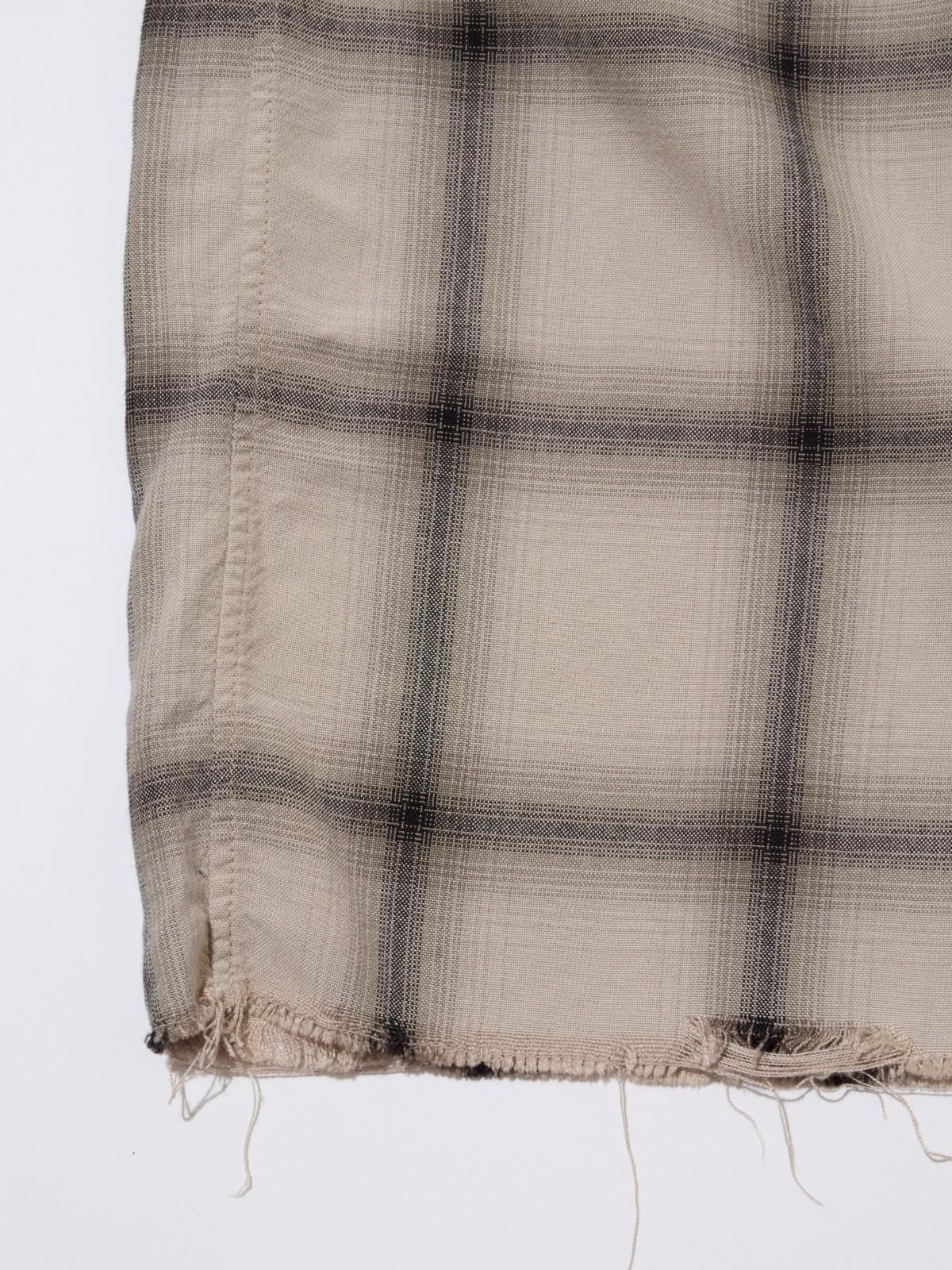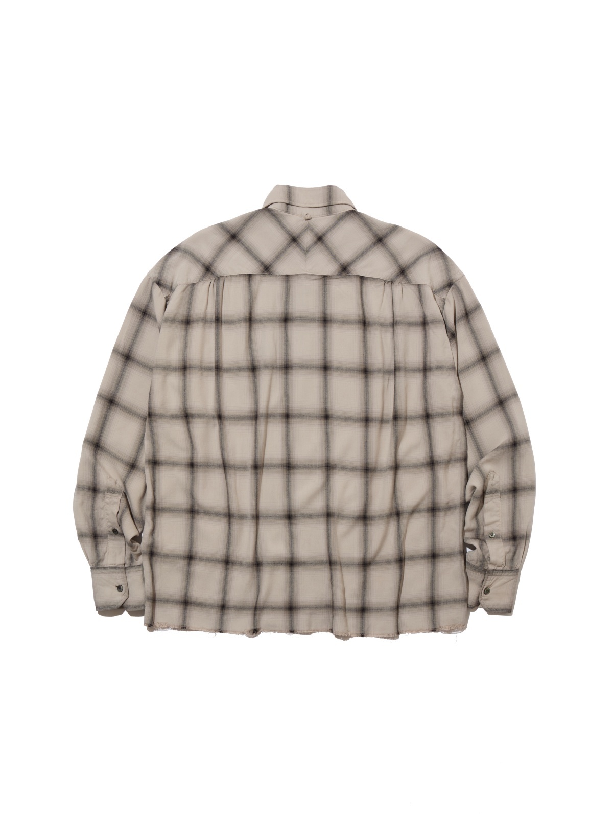 脇下・ポケットのチェックはすべて柄合わせを行い、裾は敢えて切りっぱなしに仕立て、身頃は製品染めを施しオリジナルの配色に仕上げたデザイン。