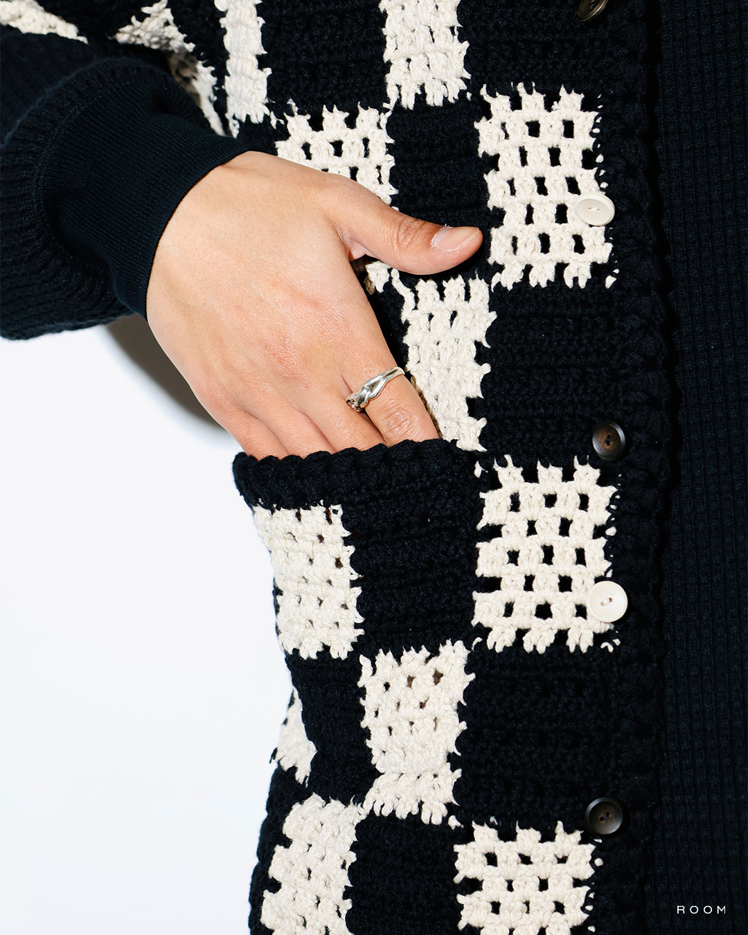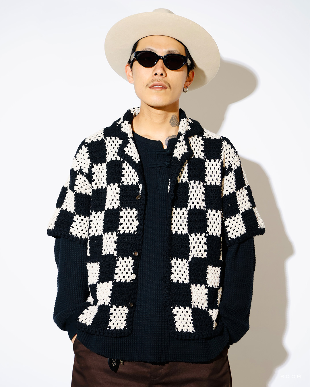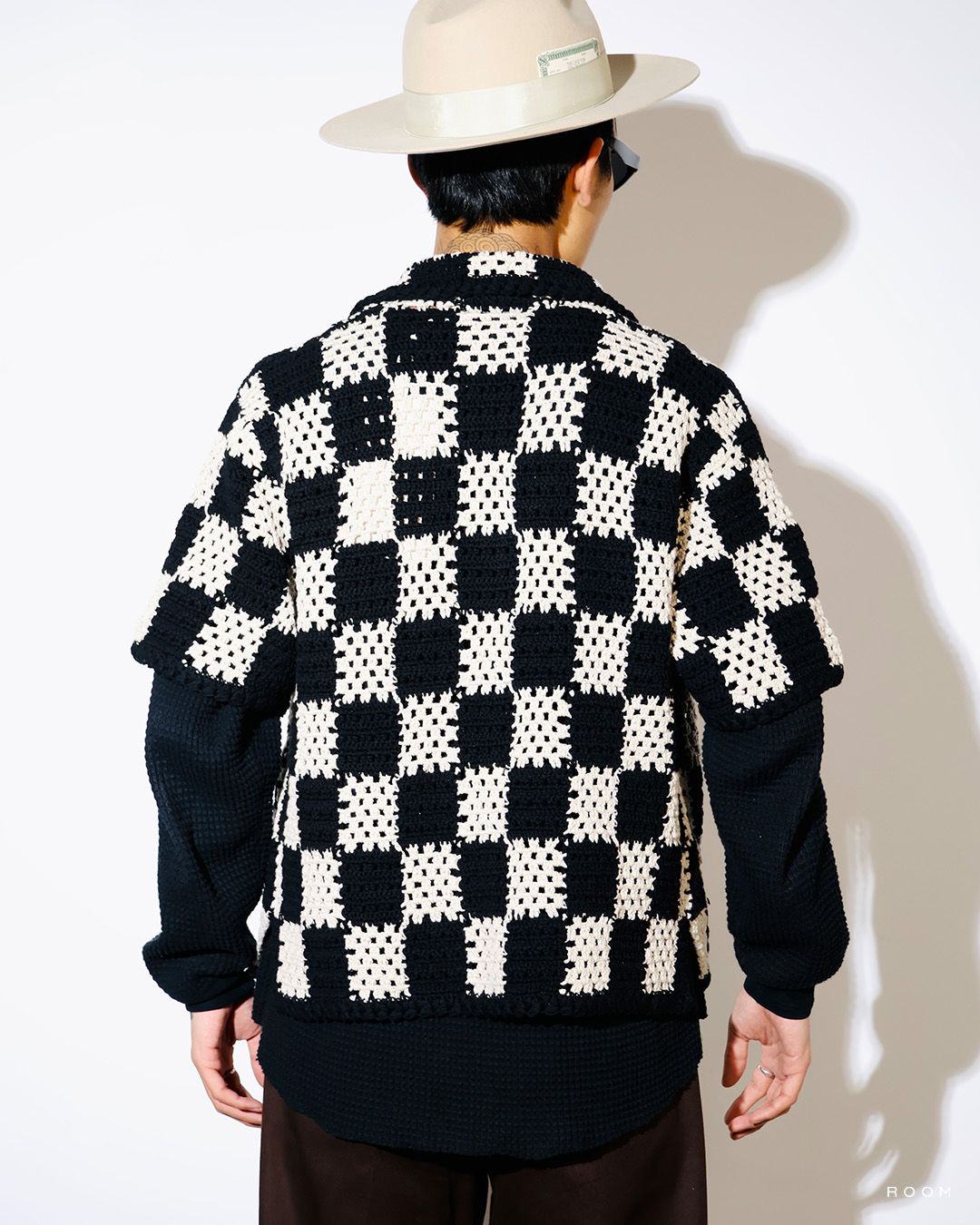 また、使用している糸の軽く仕上がる特徴や穴空きのある編地から通気性がある点、編み方や使用する色味で格子柄を表現しており、無地でも格子柄に見える点がポイント。