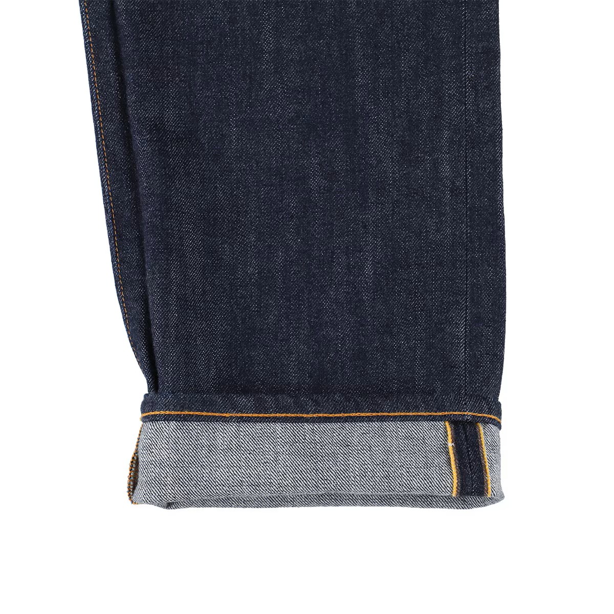 Indigoのデニム地は、ビンテージのような深い藍色、リアルな縦落ちを表現した岡山産の14ozオリジナル。セルビッチもSDカラーのイエロー/ブラウンです。