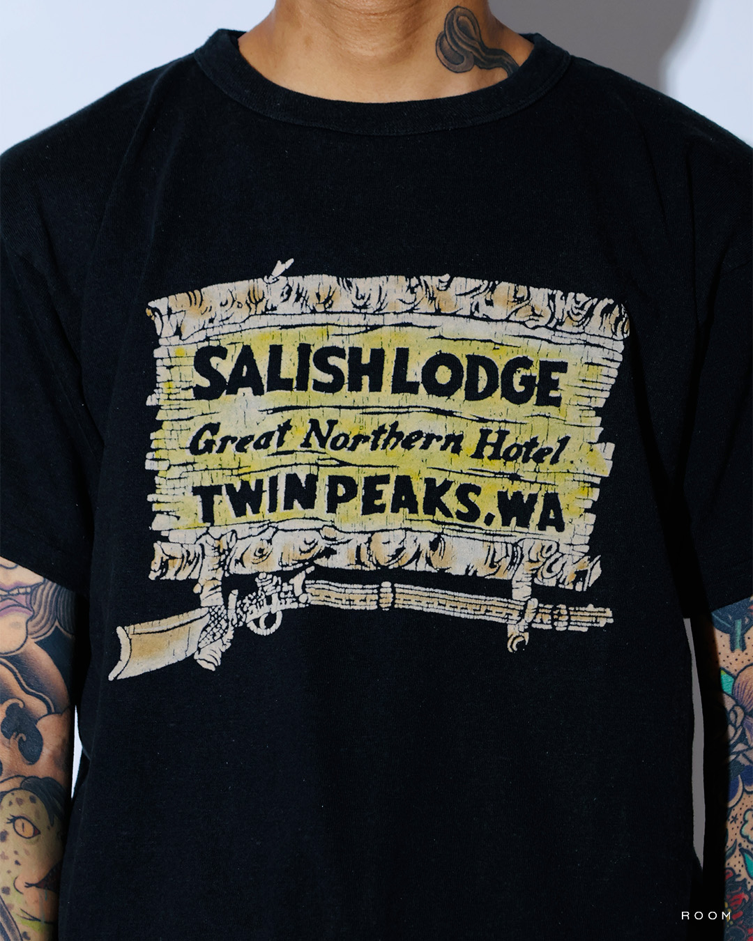 デヴィッド・リンチ監督「TWIN PEAKS」に登場するホテルを、ロケ地として使われたSALISH LODGEの土産物Tシャツという設定でイメージして製作。