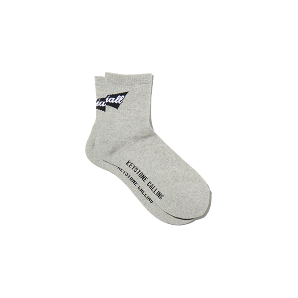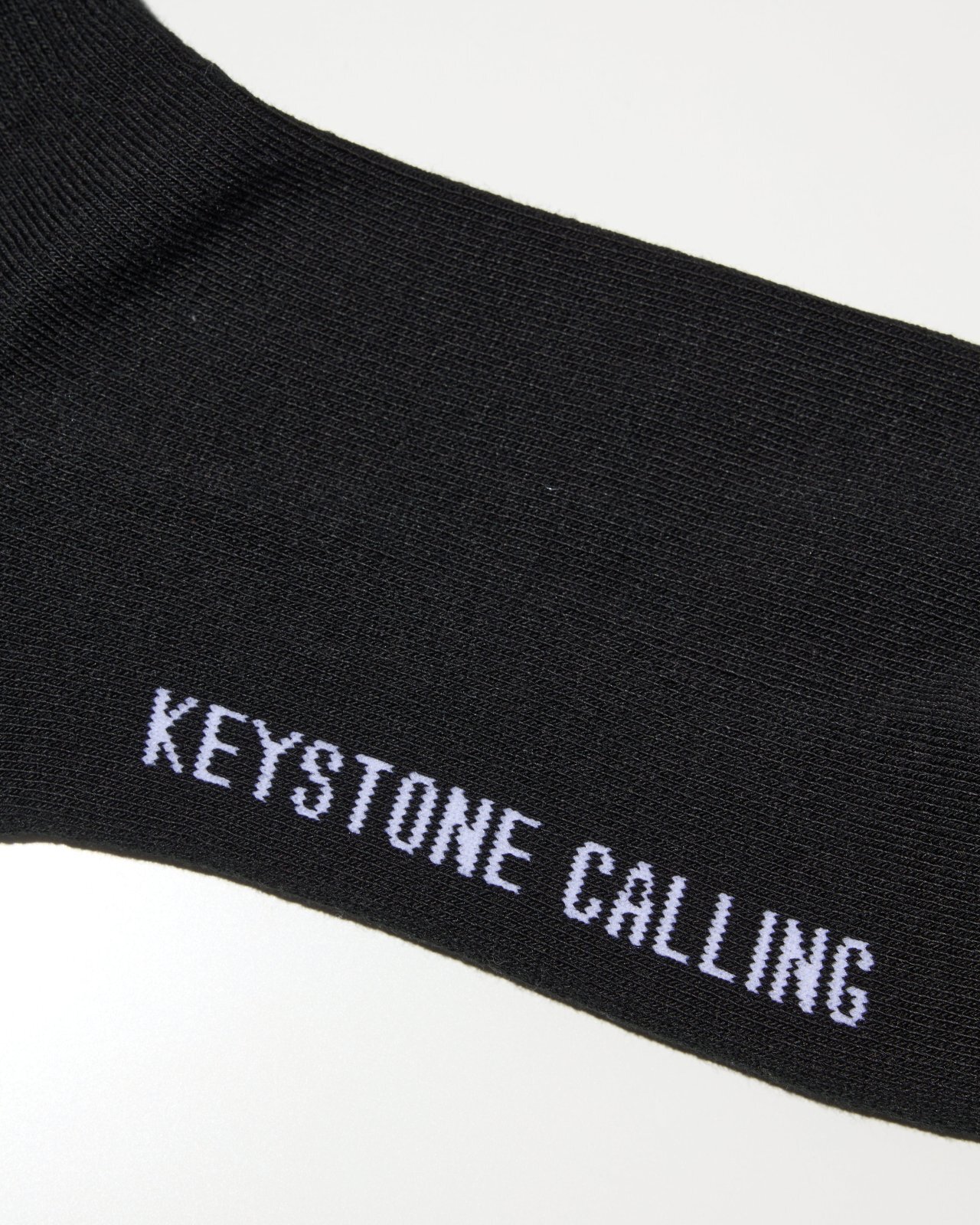 ジャガードでふくらはぎ側に「RIBBONSロゴ」、履き口裏に「WWW.RADIALL.NET」、足底に「KEYSTONE CALLING」が入る。