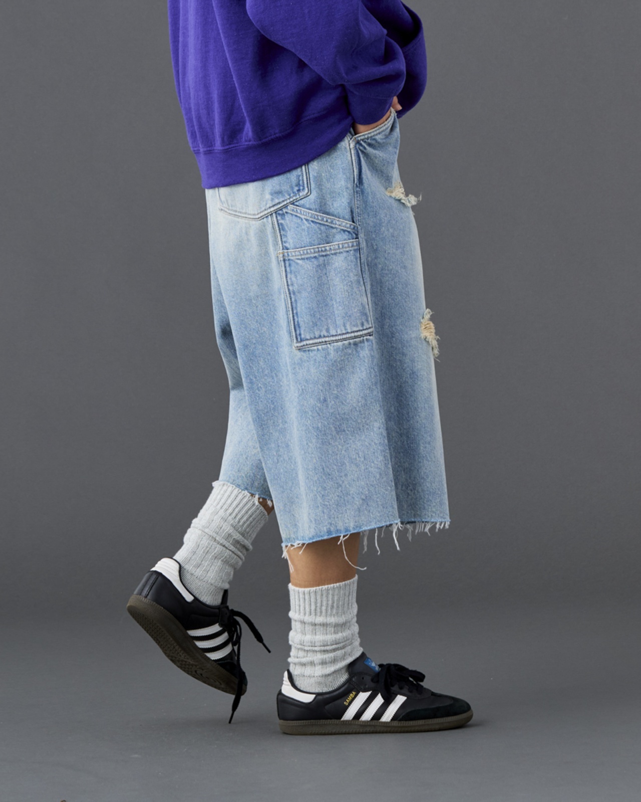 丁寧に施されたヴィンテージ加工が特徴的な、11.5oz のデニムを使用したバギーデニムショーツ。