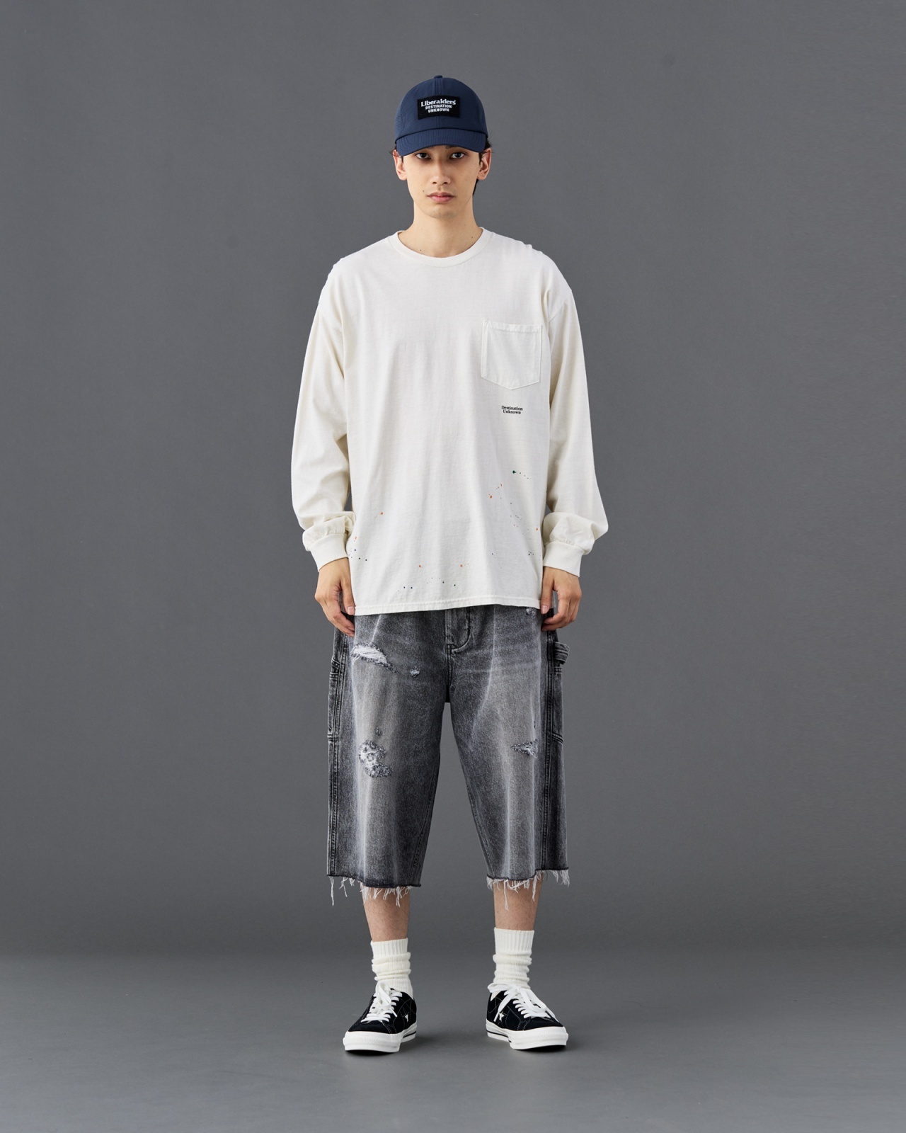 ポケット周り、ベルトループにはロープを入れて補強、全体にペンキ飛ばし加工を施したリアルな加工感のルックスに仕上げました。