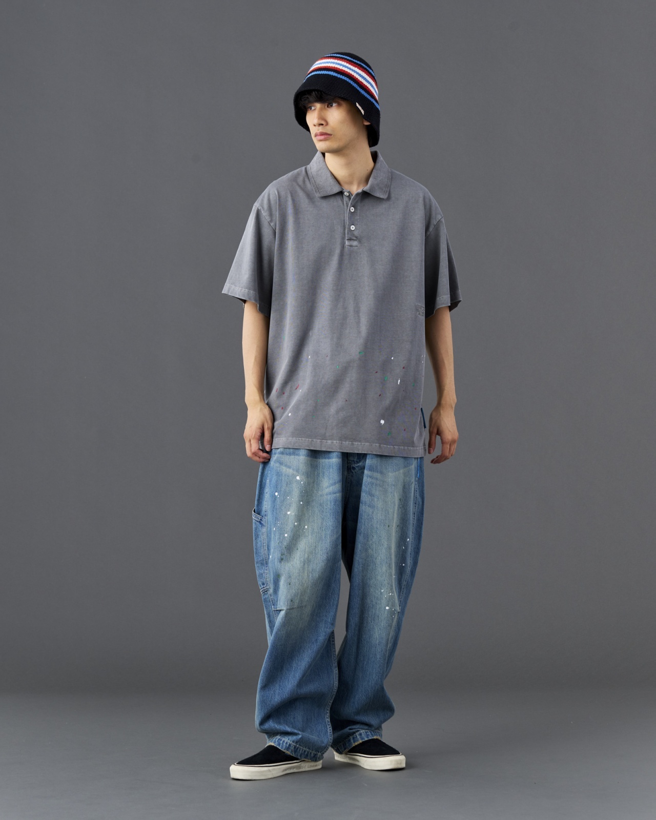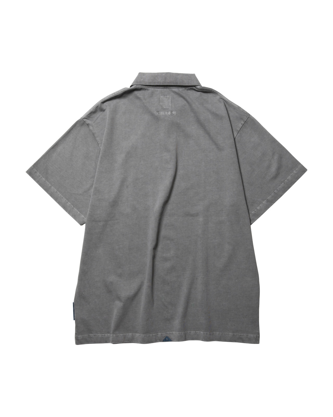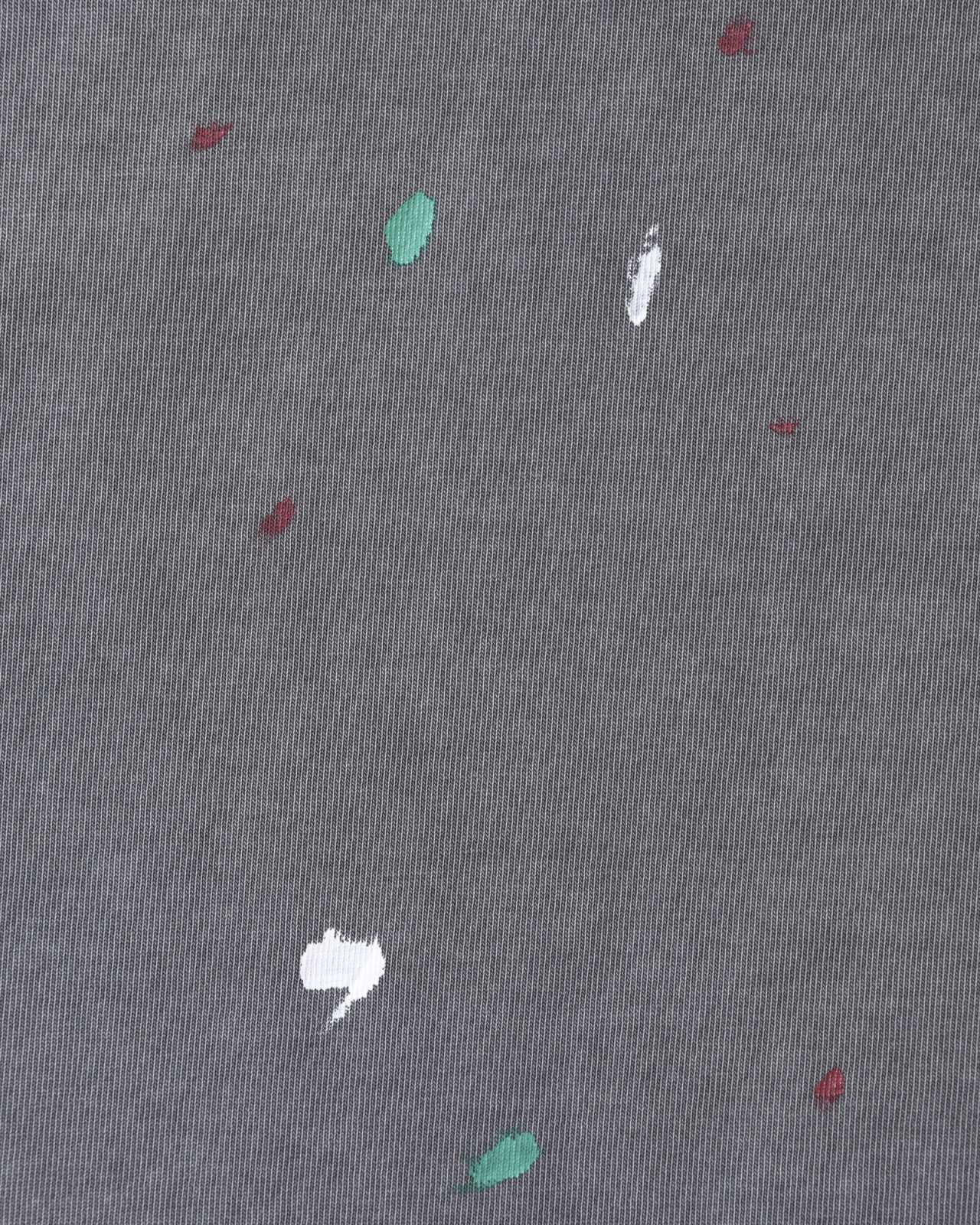 度詰の天竺生地をピグメント染めしたポロシャツ。前身頃裾にペンキ加工入ります。