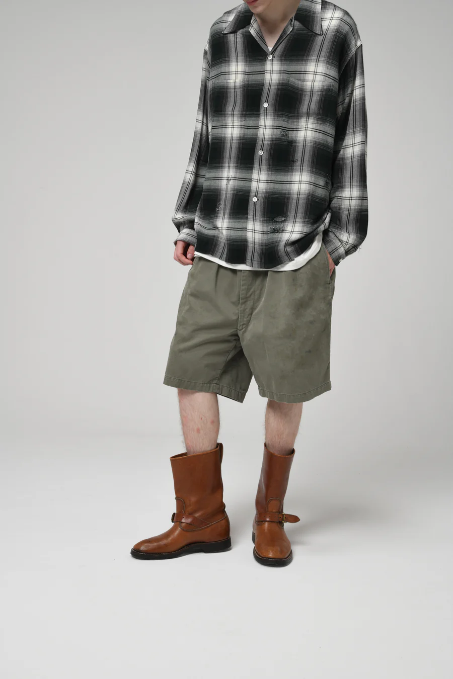 1960年代のUS ARMYツータックチノショーツを背景にしながら、ヴィンテージとは一線を画すシルエットバランスで設計。