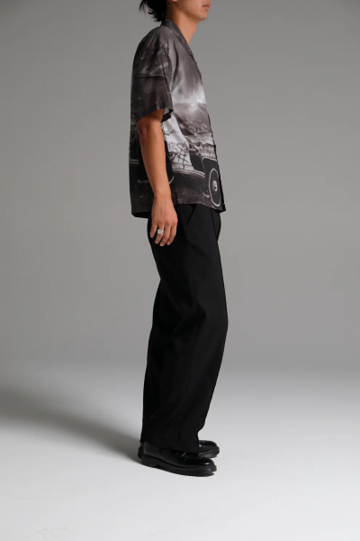 落ち感のある微光沢のレーヨン素材を使用した半袖オープンカラーシャツ。