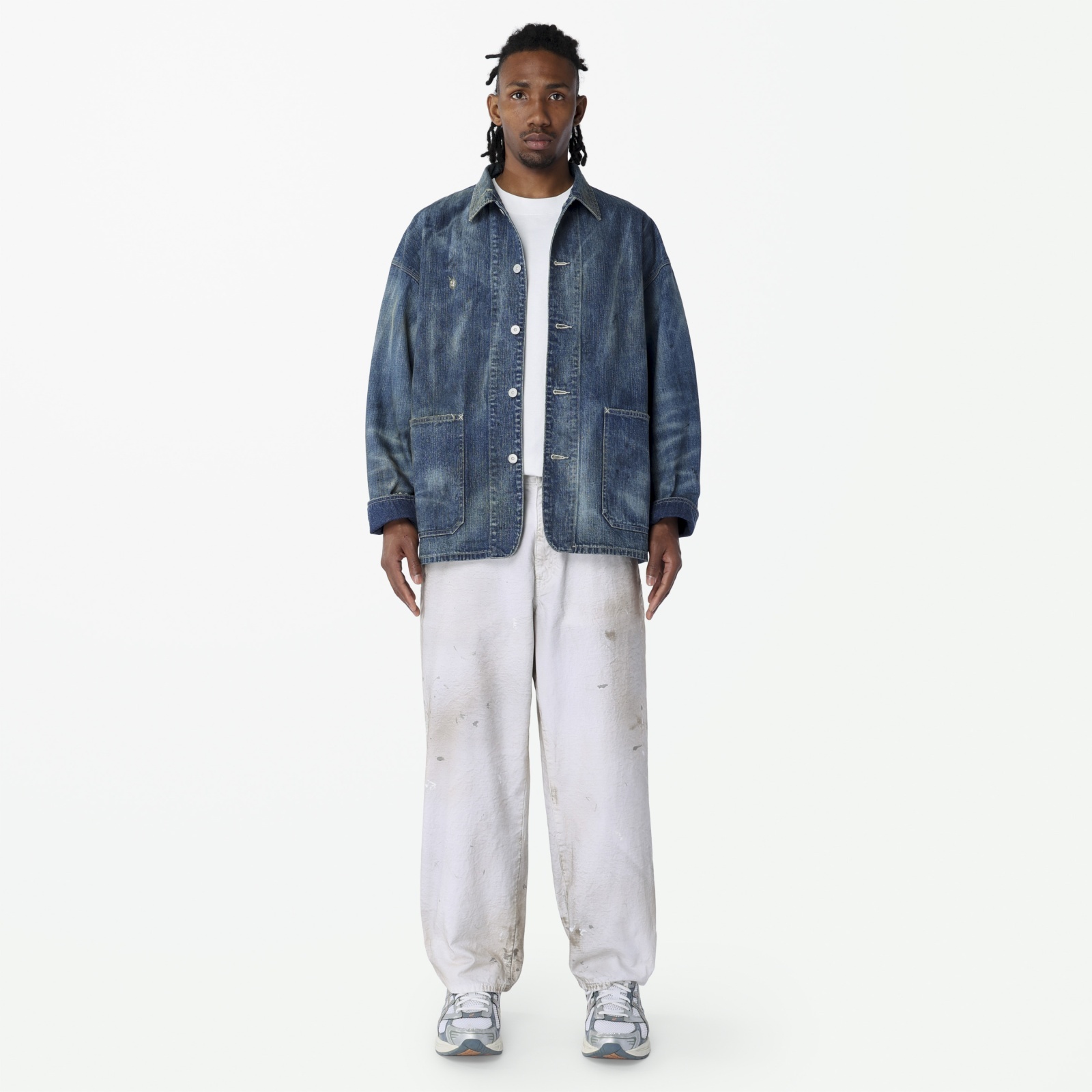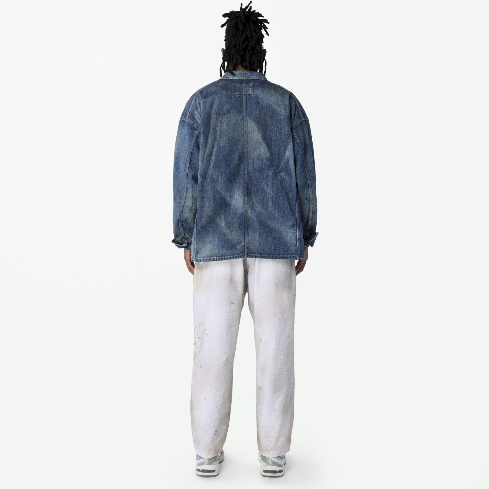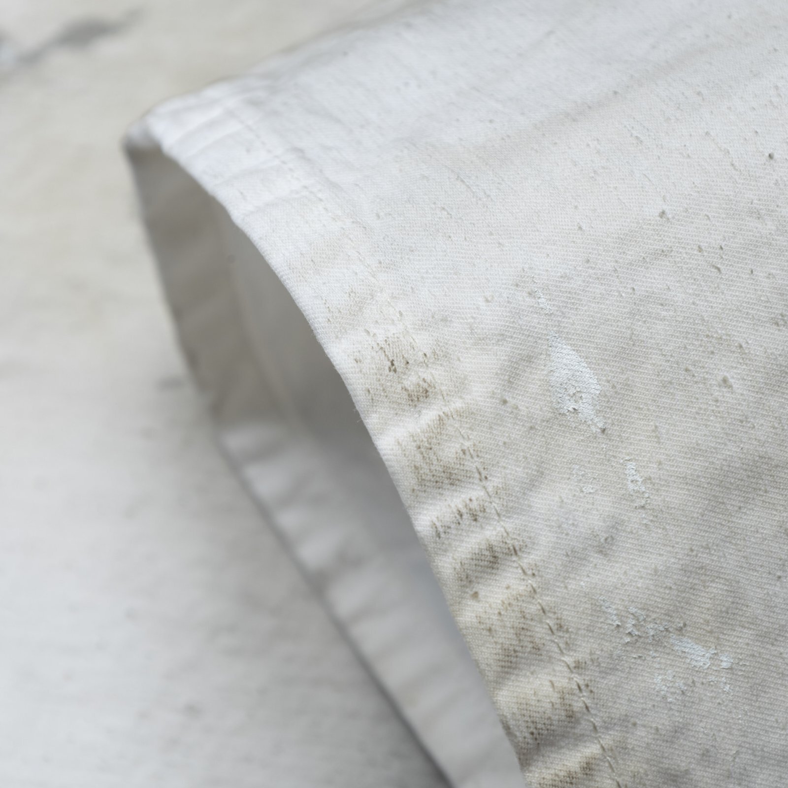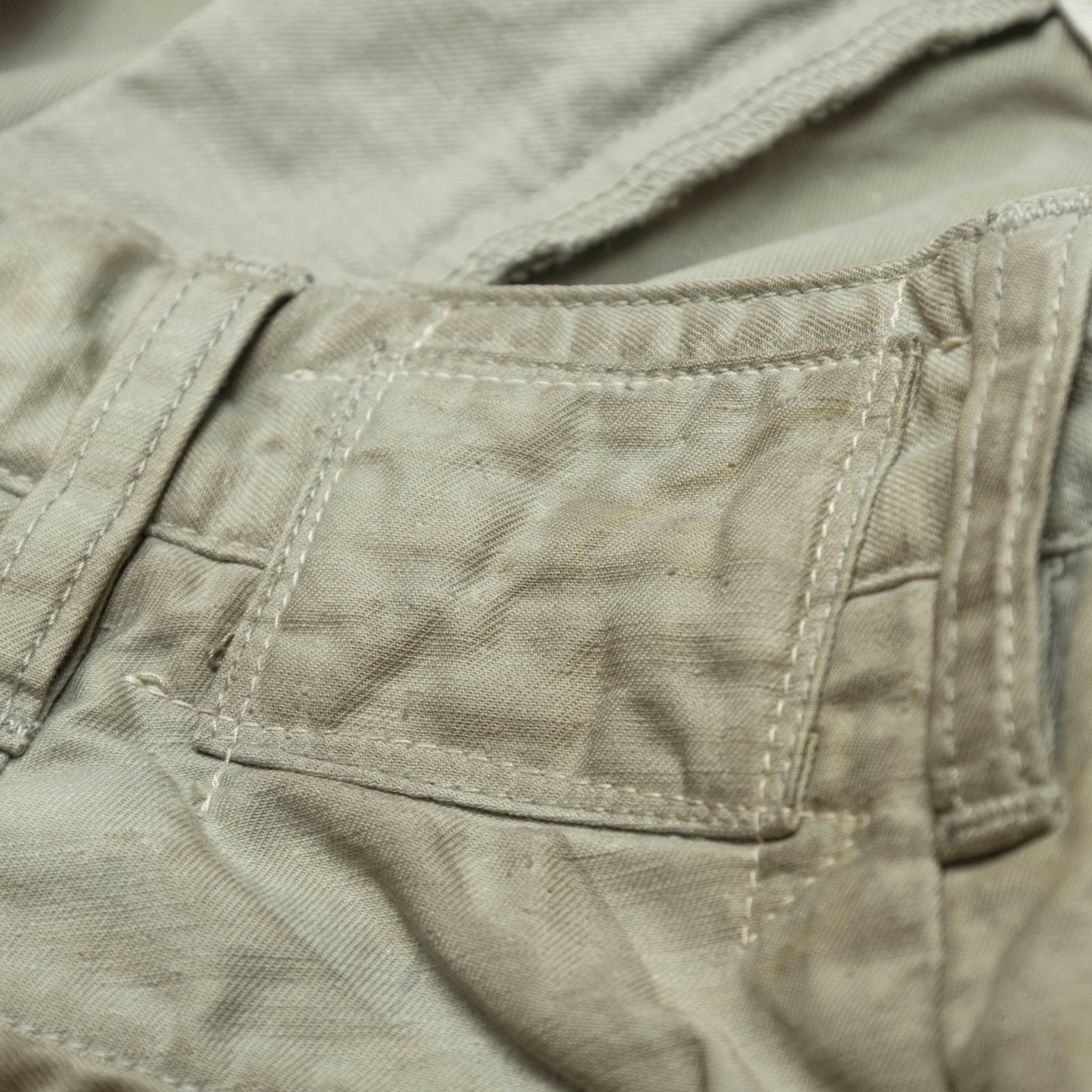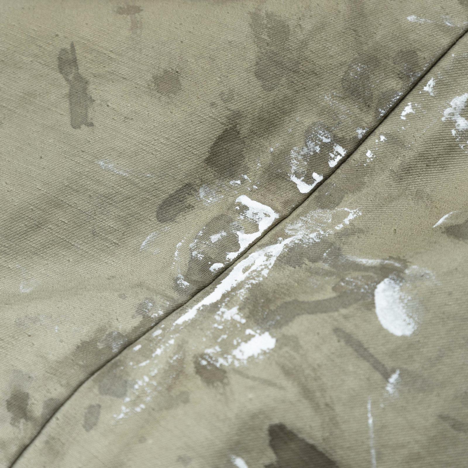 ウォッシュ、ダメージ、ペンキドリップなどあらゆる加工を施し、ヴィンテージに肉迫するクオリティで作成したチノトラウザース。フロントは5ポケット、バックはトラウザーのディテールで作成したユニークなデザイン。